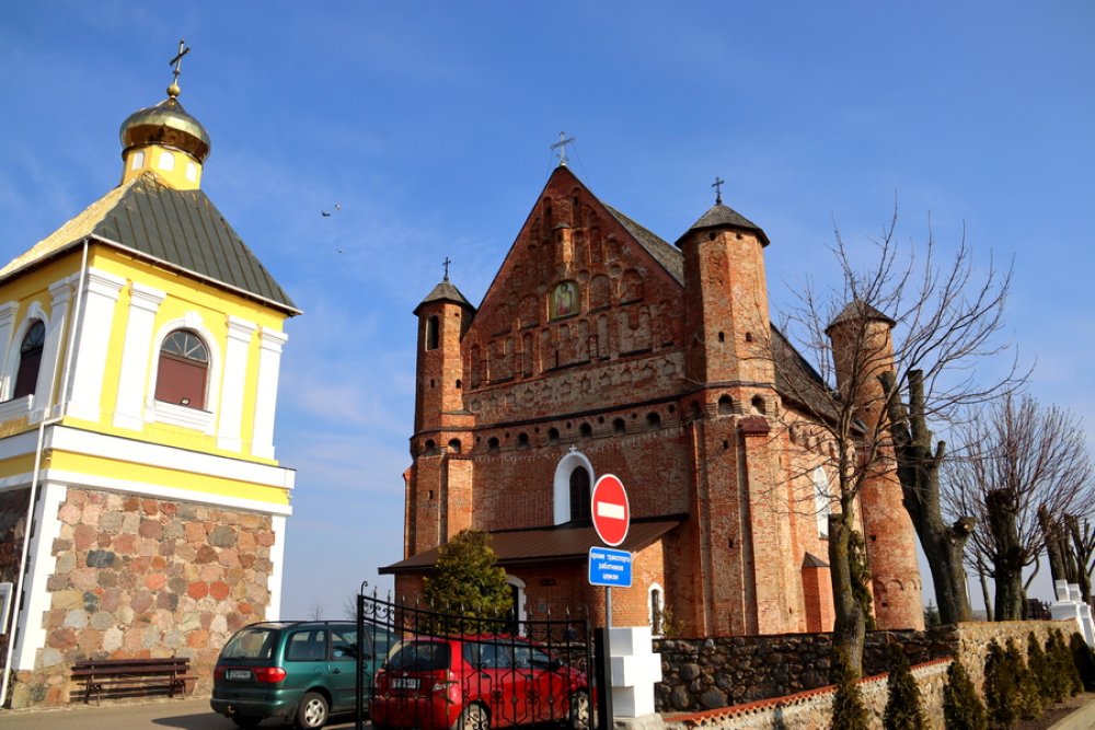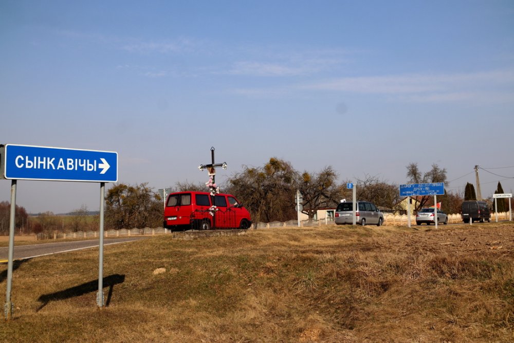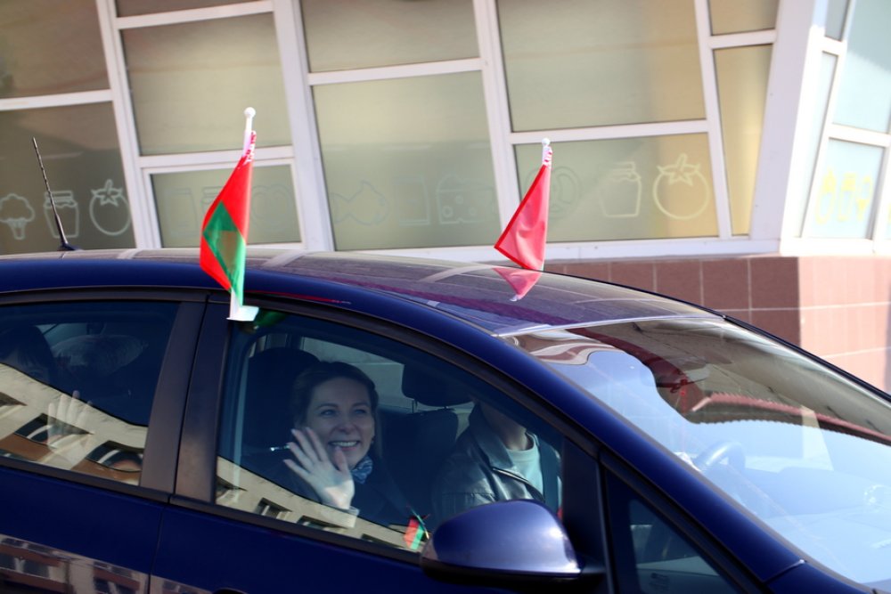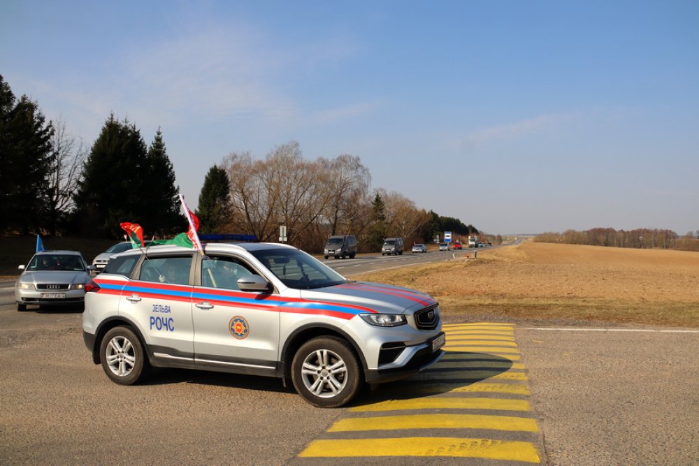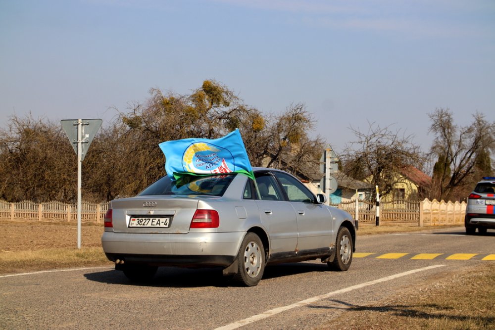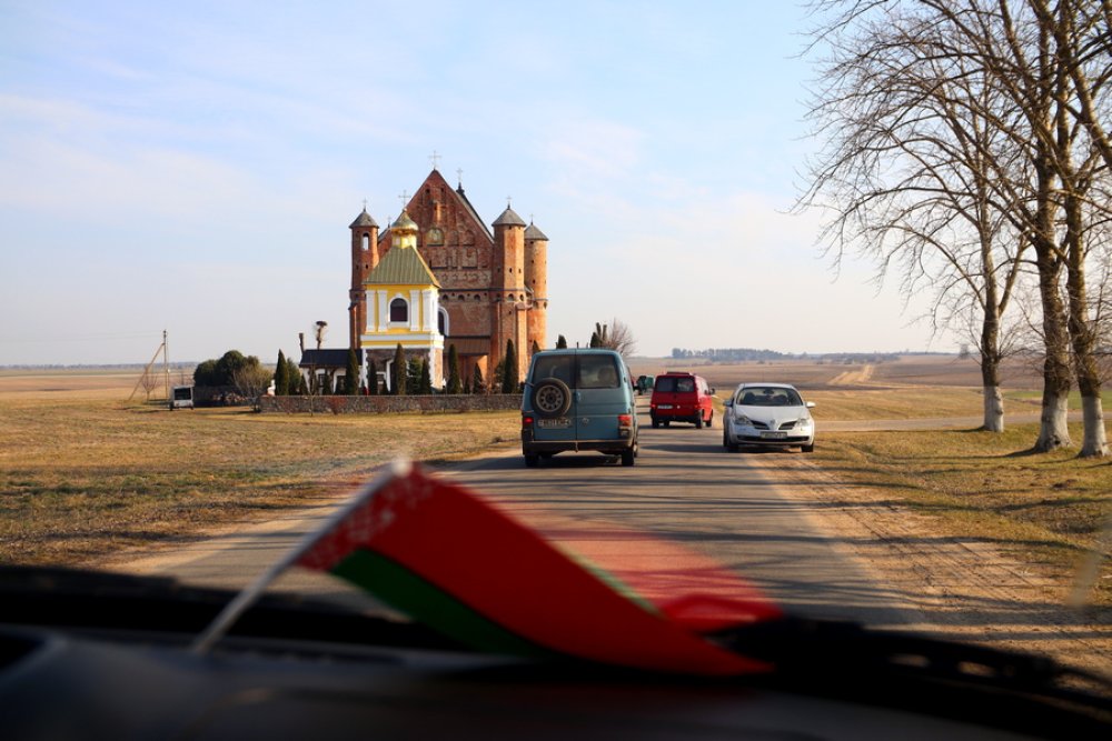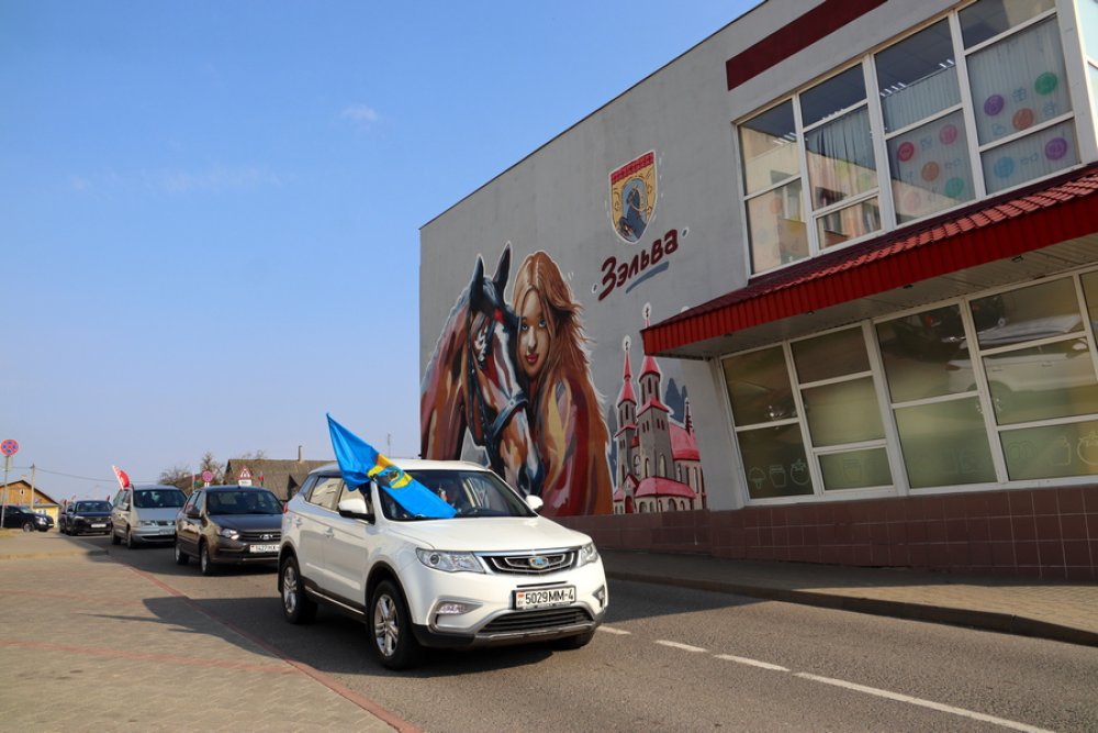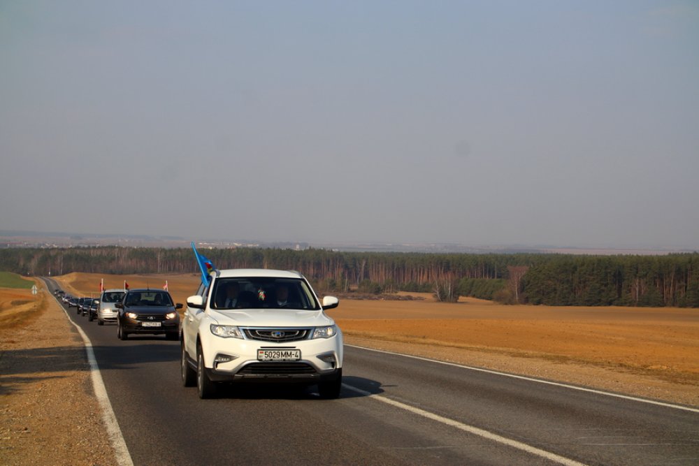 Районная акция «Приди и поклонись» началась с автомобильного пробега. Под государственными флагами колонна из Зельвы направилась в Сынковичи.