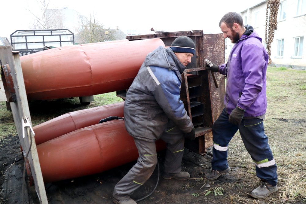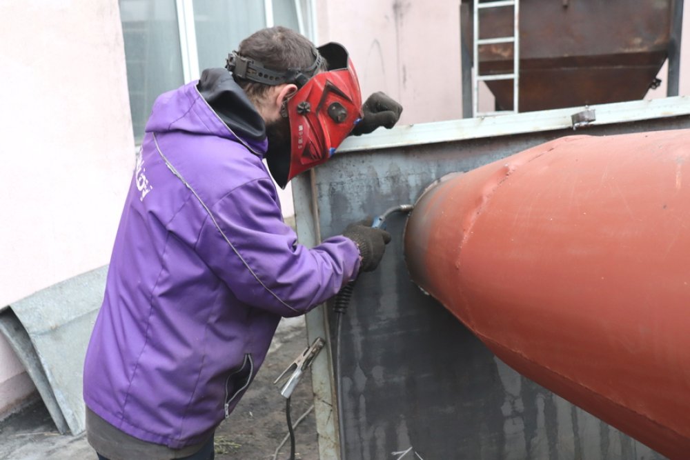 И вот после ремонта устройство вернулось на котельную. Монтировать фильтр начали на земле. После завершения работ его установят на прежнее место.