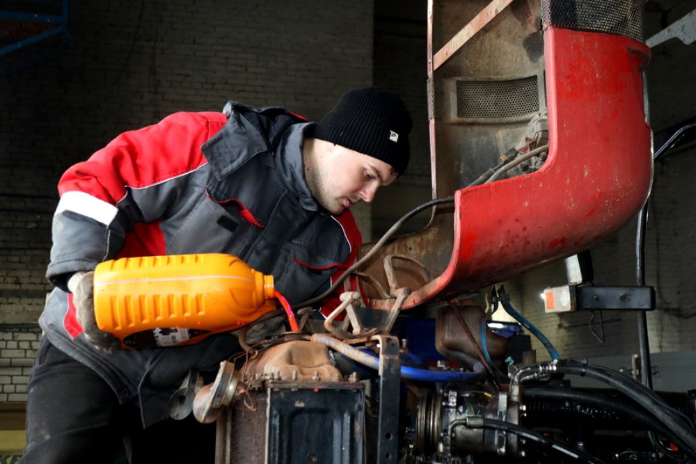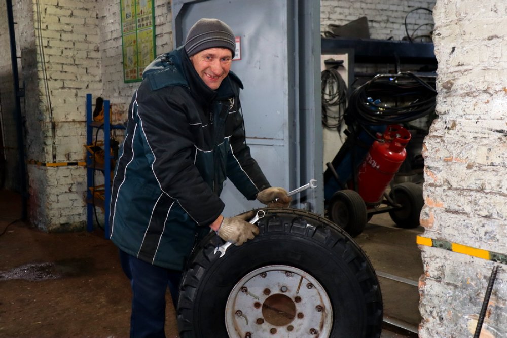 Ремонт идет поэтапно, все обязанности распределены. Сейчас вот в мастерской заняты подготовкой к техосмотру своих МТЗ-1221 механизаторы Валерий Жук и Дмитрий Ковчун. С инструментами в руках устраняет неполадки двигателя МТЗ-1223 Дмитрий Голуб. Водитель Андрей Кучинский чинит рулевой насос, а Геннадий Харитончик меняет колеса.