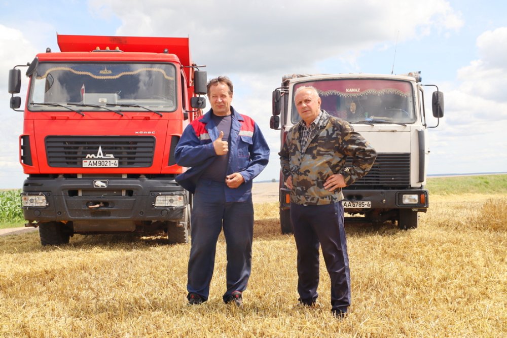 Рядом с ним трудятся другие опытные комбайнеры: Владимир Карнацевич, Сергей Суша и его верный помощник Евгений Богданович. На отвозке зерна задействованы Анатолий Щилик и Дмитрий Якусевич, управляющие мощными МАЗами, а на тракторе неустанно работает Сергей Копылович. На других участках полей кипит работа по прессовке соломы – всё как единое целое.