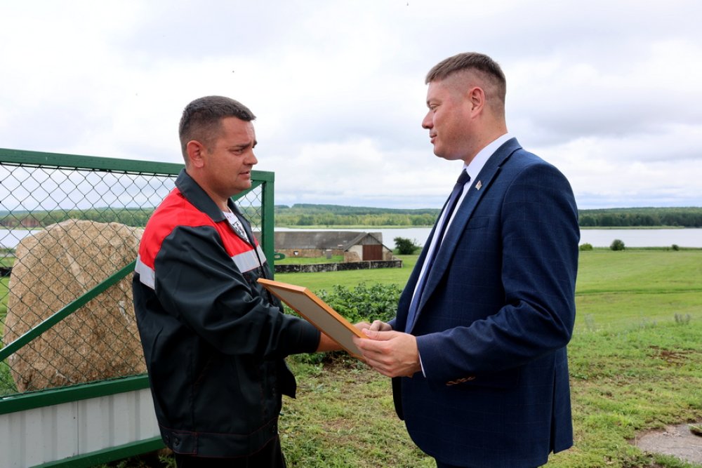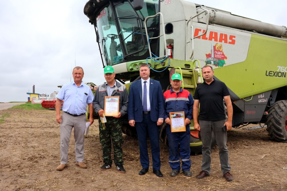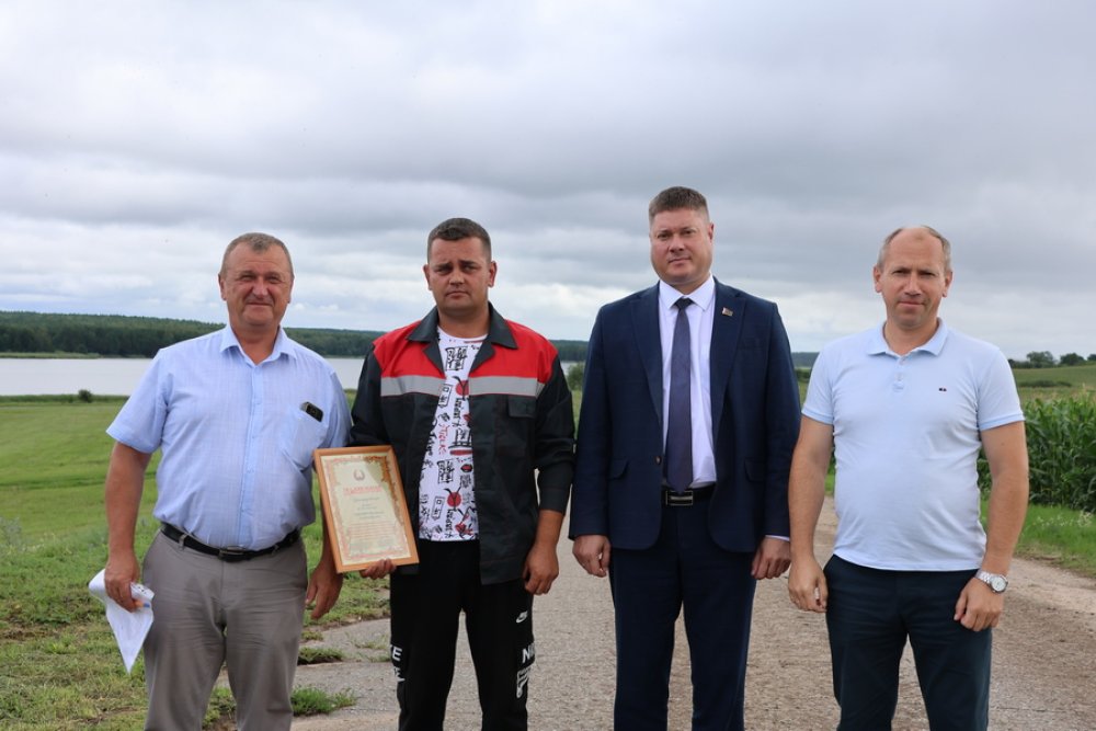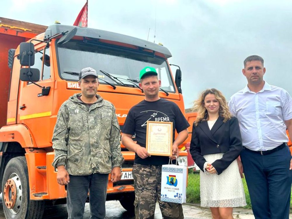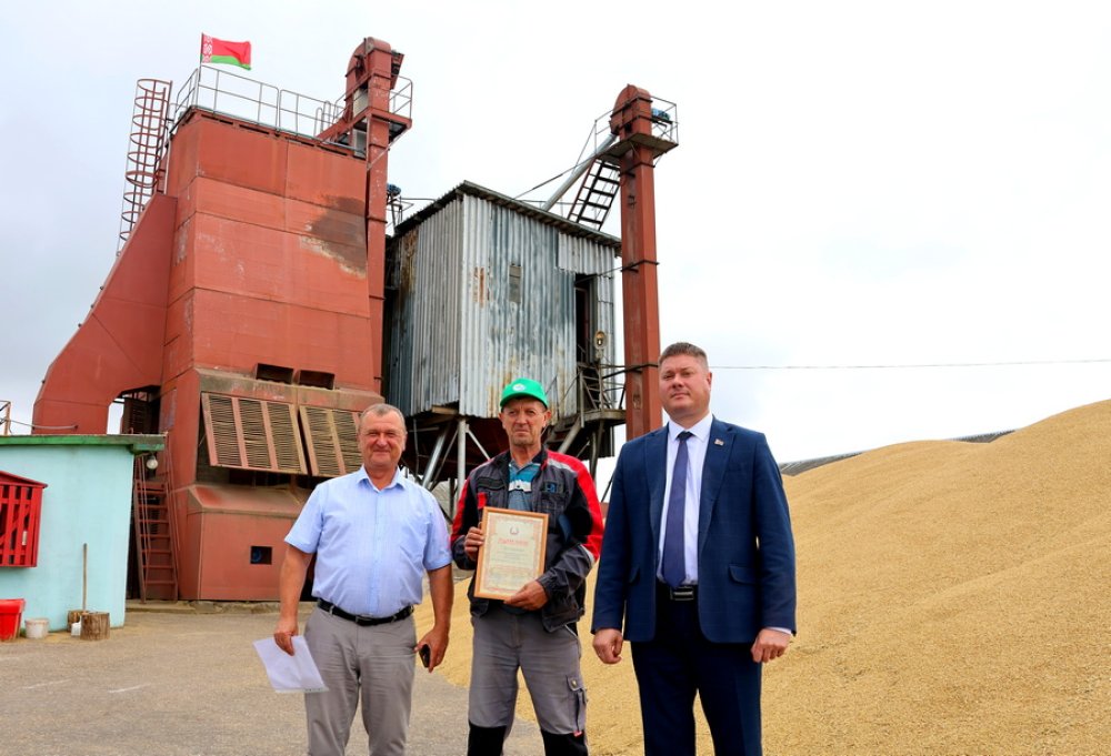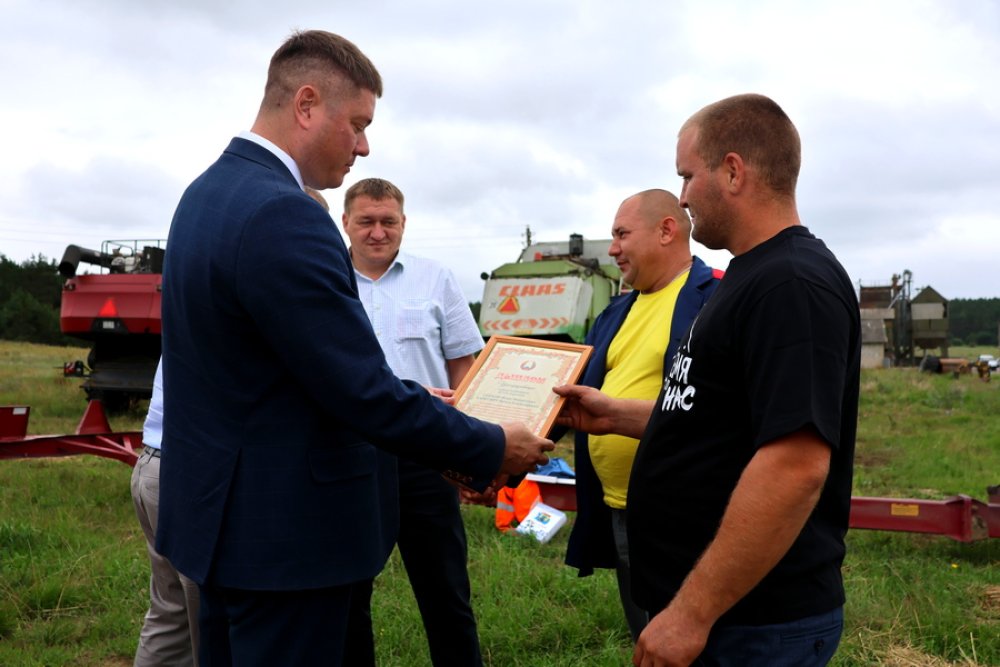 А вот награждение проходит в любую погоду. В рамках районных профсоюзных соревнований «Жатва-2025» председатель райисполкома Денис Ольшевский, его заместитель Сергей Сыско и лидер райкома профсоюза работников АПК Валерий Парфенчик чествуют лучших тружеников прямиком на рабочих местах.