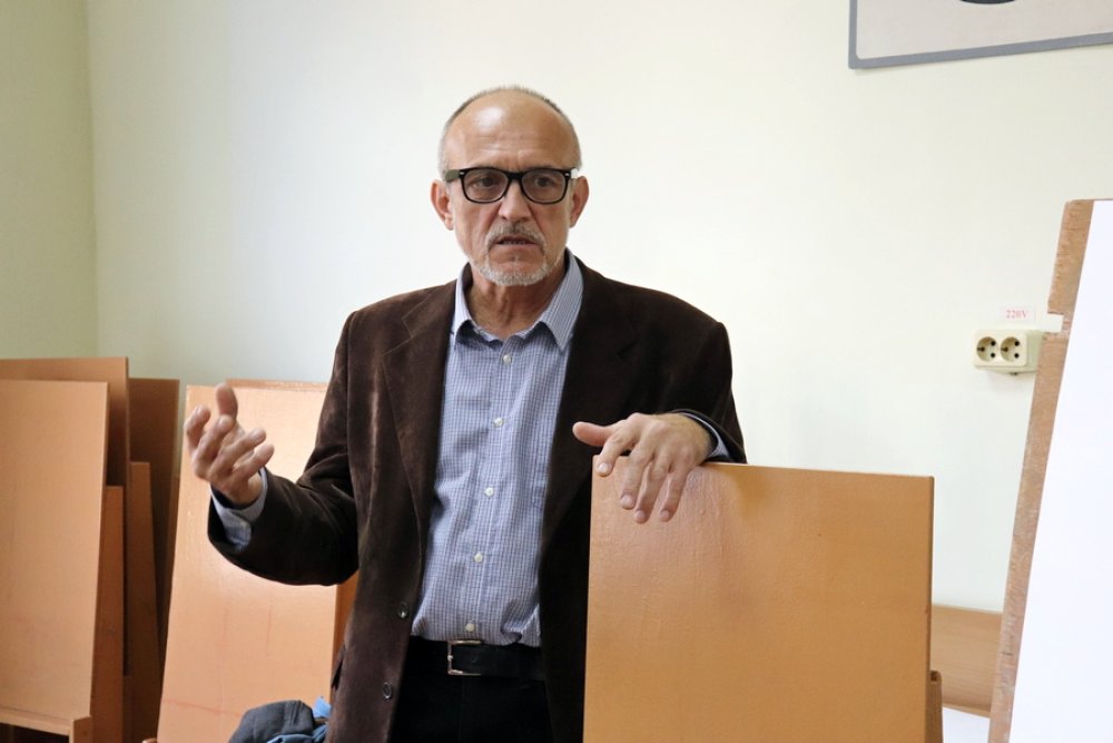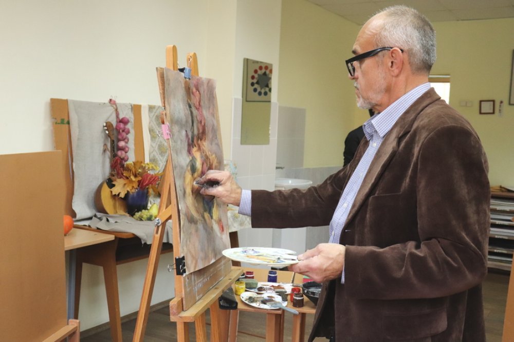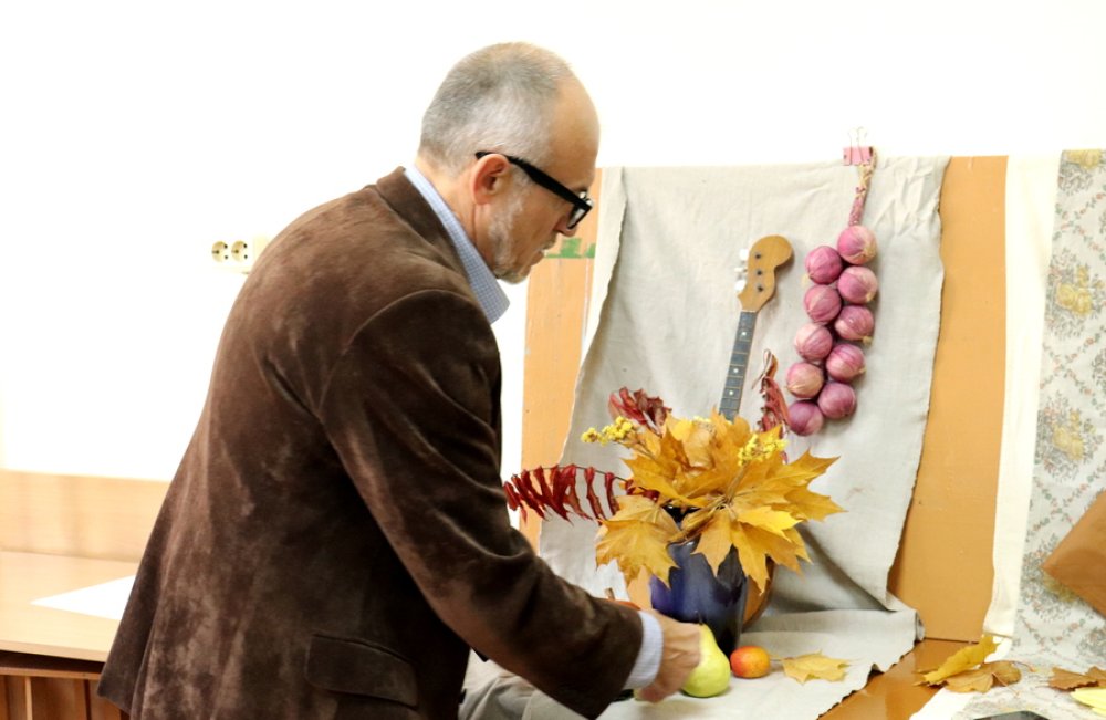 Затем Алексей Мясников ознакомился с работами юных зельвенских художников и любезно согласился провести мастер-класс по живописи, который посвятил осеннему натюрморту и… отношению художника к своему произведению.