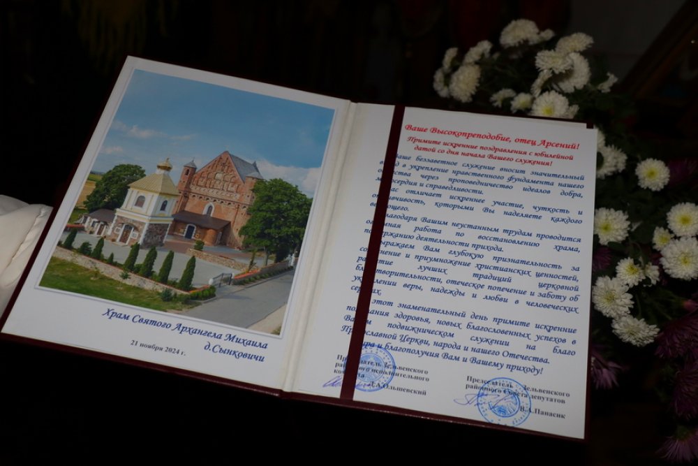 В честь большого праздника и в знак глубокой признательности за долгие годы служения настоятелю храма отцу Арсению был адресован поздравительный лист председателя райисполкома Дениса Ольшевского и председателя районного Совета депутатов Вадима Панасика. Обращаясь к протоиерею Арсению и приходу, Денис Александрович отметил, что священник отличается чуткостью и отзывчивостью, внимательным участием в жизни каждого верующего. Благодаря его неустанному труду, проводится большая работа по восстановлению храма, поддержанию деятельности прихода, сохраняются лучшие духовные традиции. Глава района пожелал благополучия священнослужителю и всему сынковичскому приходу.