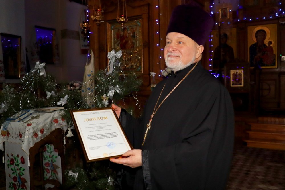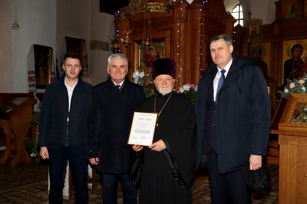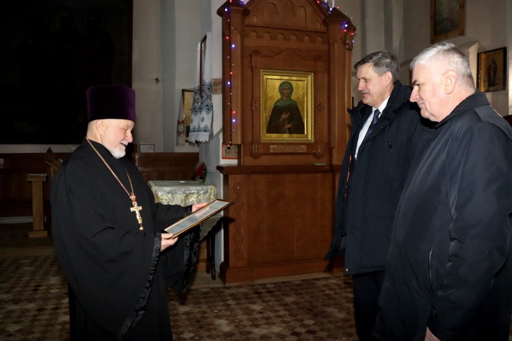 Награду заместитель председателя райисполкома Сергей Лойко соместно с депутатом Палаты представителей Национального собрания Республики Беларусь Валентином Семеняко вручили настоятелю церкви протоиерею Арсению Ананко.