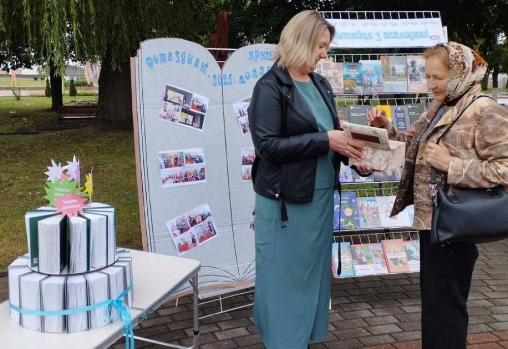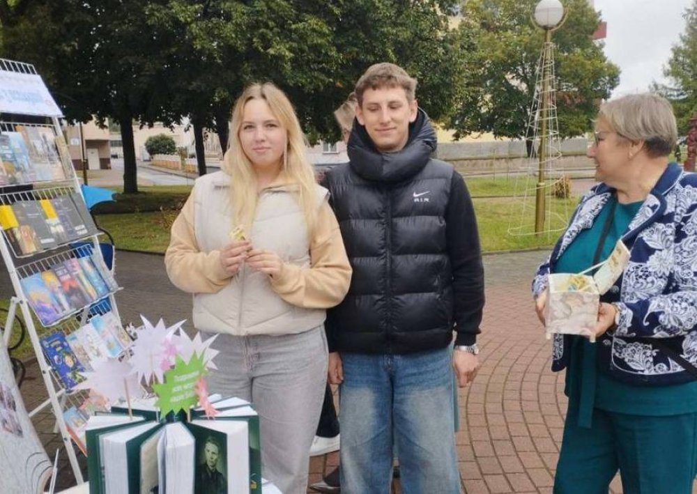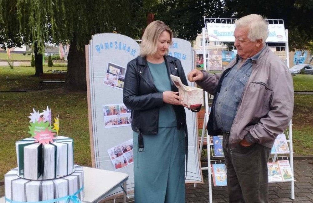 Няглядзячы на дрэннае надвор’е, аматары чытання падыходзілі і цікавіліся экспазіцыяй бібліятэкі, якую арганізавалі ў скверы пасёлка, віншавалі са святам.
