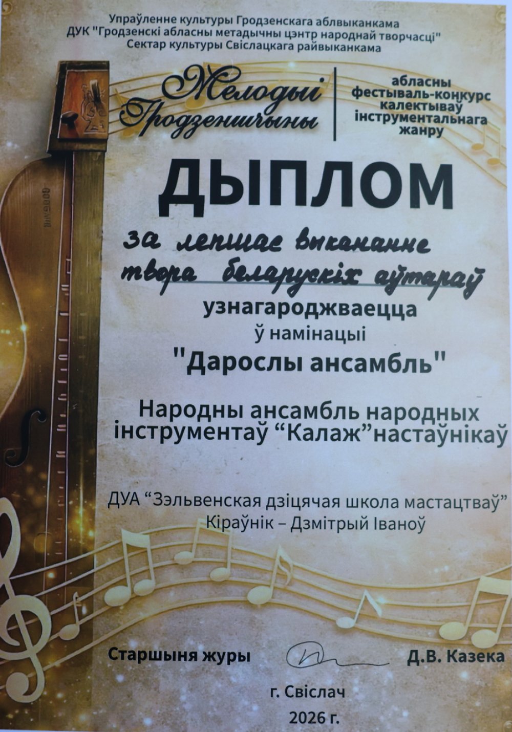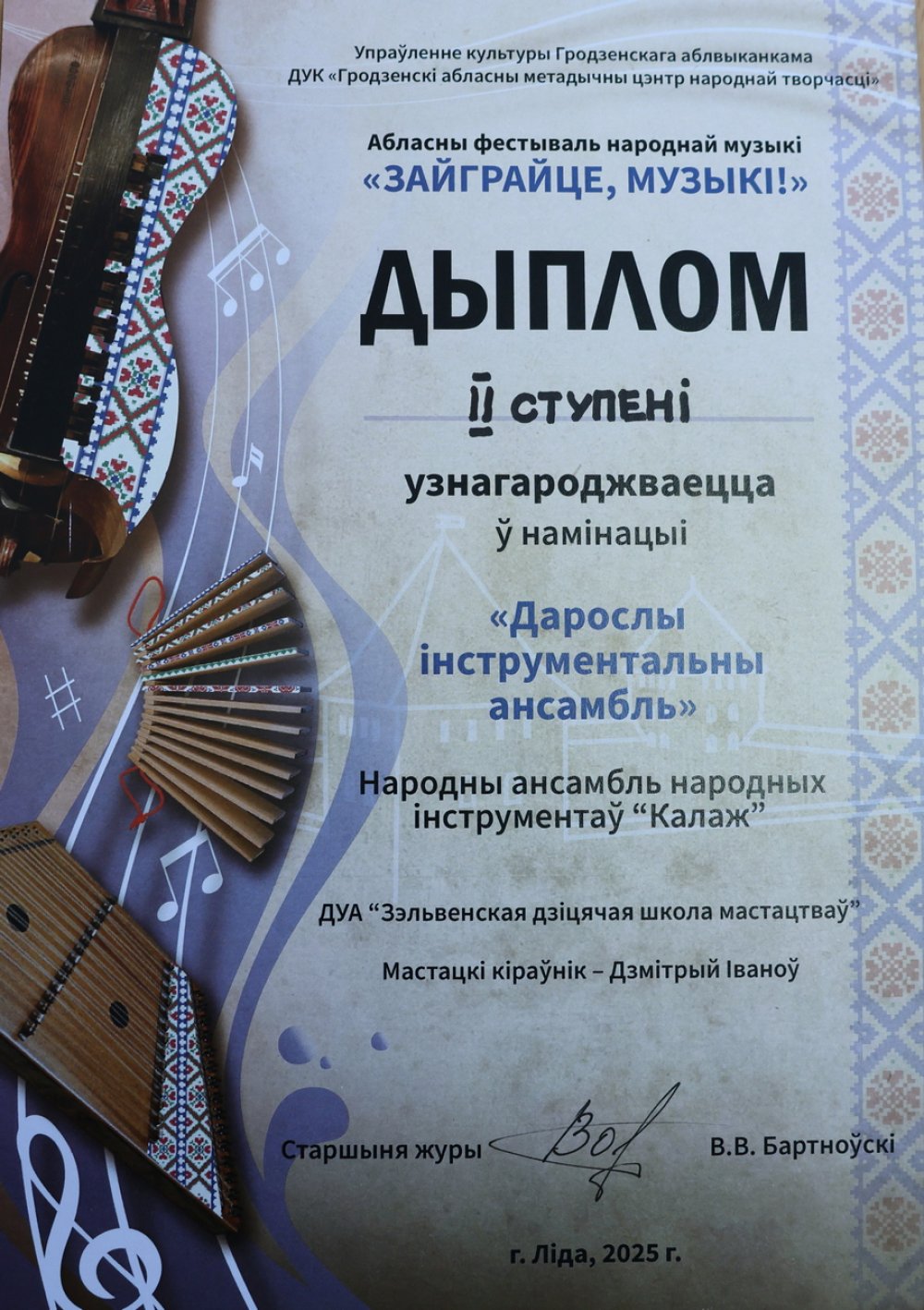 Последние месяцы стали для творческой семьи особенно урожайными. Минувшей осенью, 25 октября, в Лиде прошел областной фестиваль народной музыки «Зайграйце, музыкі!». Жюри по достоинству оценило яркую палитру звуков «Коллажа»: диплом второй степени и памятный приз фестиваля отправились в Зельву.