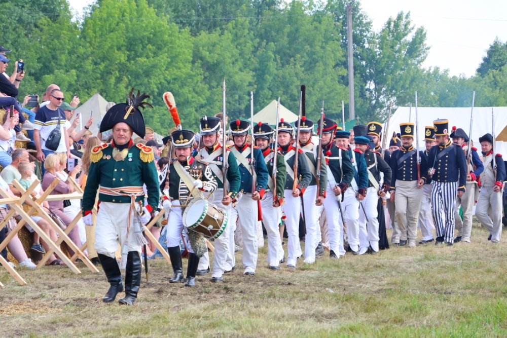 Первыми, чеканя шаг, прошли суровые солдаты Великой Отечественной войны 1812 года, в мундирах образца тех лет, в киверах, с ружьями, готовые к бою. В каждом их движении чувствовалась решимость и отвага.