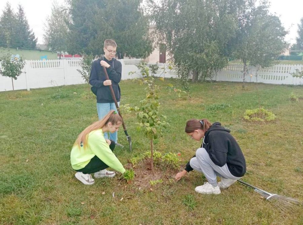 Учащиеся средней школы №3 проводят работы в саду.