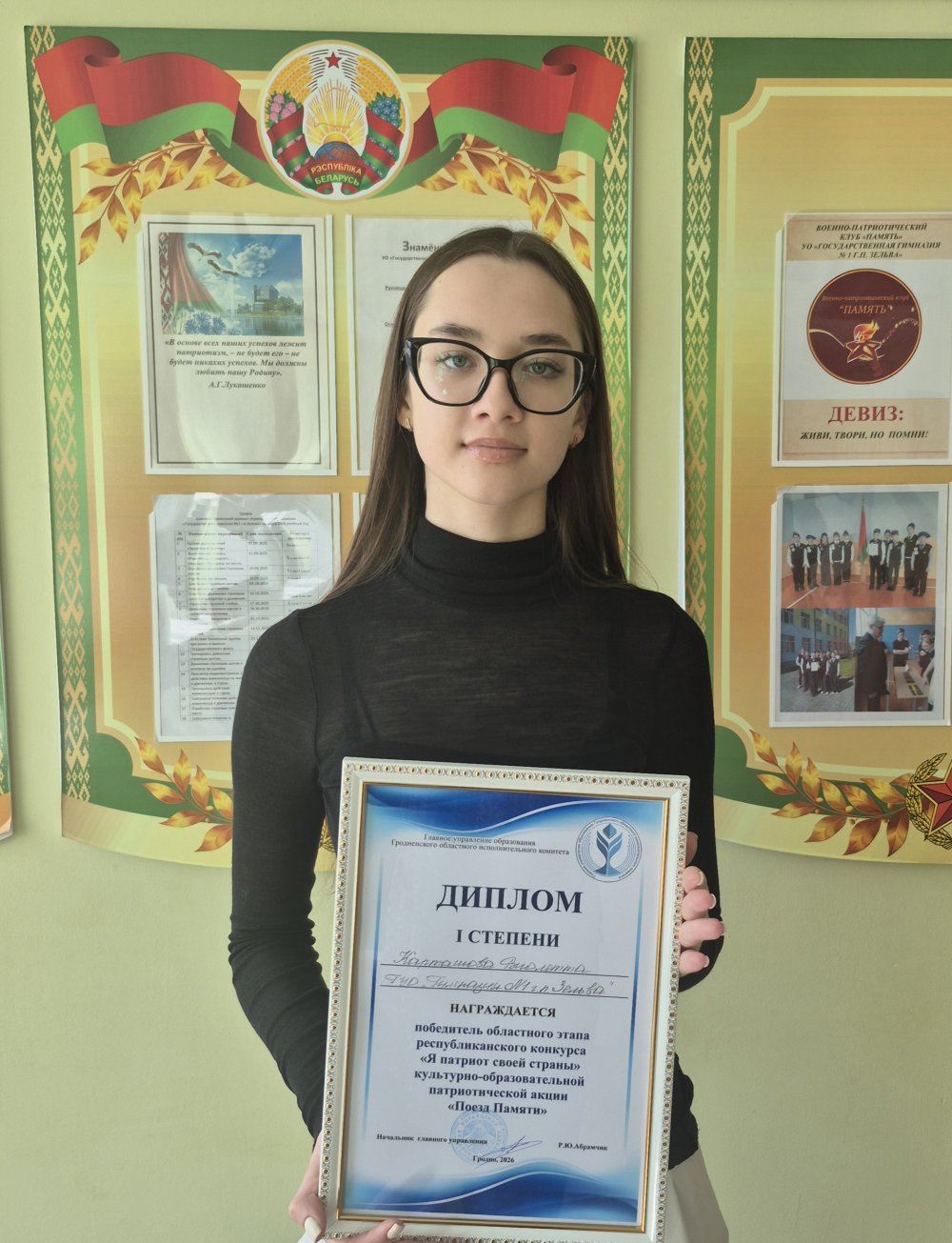 18 марта в Гродно прошел областной этап республиканского конкурса «Я патриот своей страны», по итогам которого десятиклассница гимназии №1 г.п. Зельва Виолетта Карташова удостоена Диплома I степени.