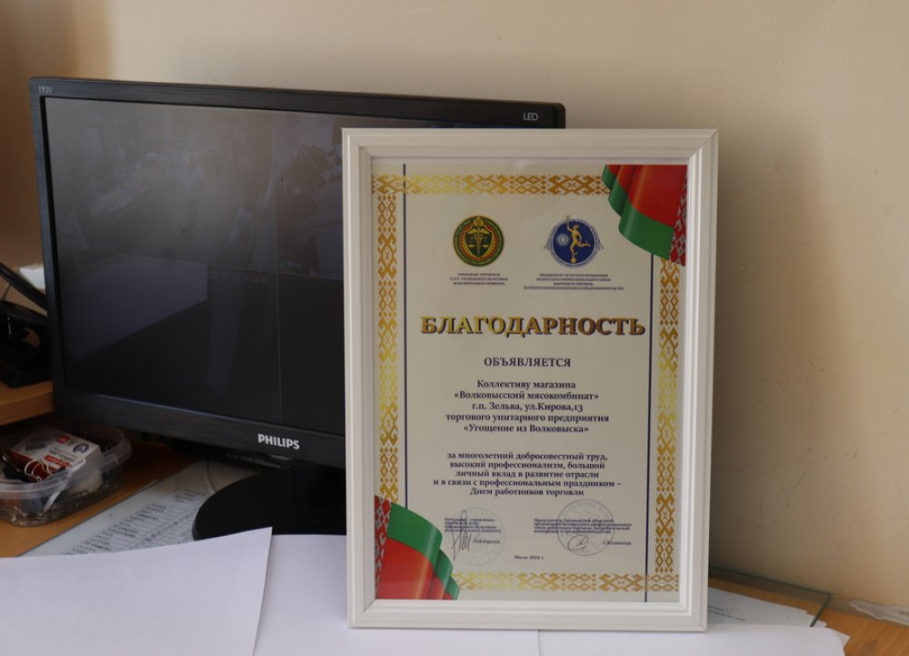 Всех из магазина «Волковыссого мясокомбината» смело можно назвать любящими свое дело людьми. Подтверждением может служить благодарность управления торговли услуг Гродненского областного исполнительного комитета, которой коллектив удостоен в прошлом году за высокие достижения в труде и в связи со 100-летием образования органов торговли Беларуси. И в настоящий момент успешная деятельность торгового предприятия «Угощение из Волковыска» в том числе зависит от усилий зельвенцев.