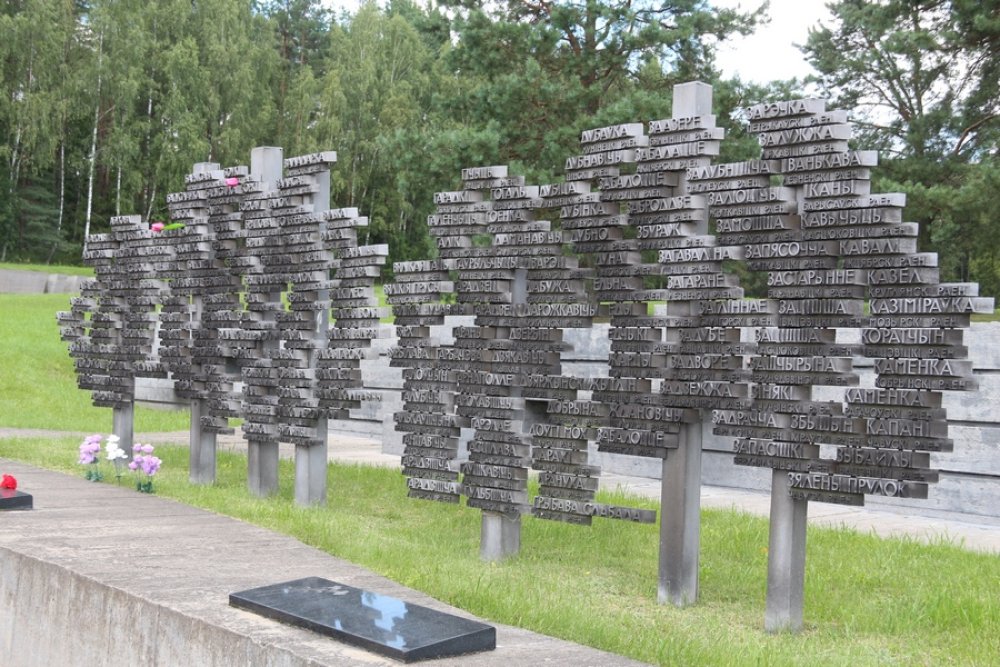 Деревню после войны не восстановили, но на ее месте в память обо всех погибших белорусах, о сожженных деревнях был возведен мемориальный комплекс. При приближении к нему сердце переполняется болью. Слезы накатываются на глаза при виде высокой бронзовой скульптуры мужчины с мальчиком на руках. Это символ выжившего Иосифа Каминского и его сына, которого он вынес из пепелища и который умер прямо у отца на груди. Справа от «Непокоренного» – черная плита-крыша, символизирующая тот амбар, где произошла трагедия. Рядом – братская могила со словами-наказом мертвых к живым. Как напоминание о том, что здесь когда-то была центральная улица, по обе стороны которой стояли дома, сейчас установлены памятники-срубы. И раздается звон колоколов, которые находятся в символической печной трубе. В память о живших здесь семьях на каждом обелиске прикреплена табличка с именами и фамилиями.