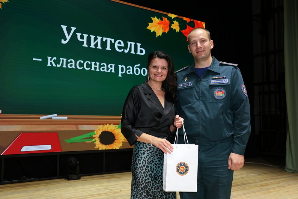 К поздравлениям присоединился начальник Зельвенского районного отдела по чрезвычайным ситуациям подполковник внутренней службы Алексей Михайлович Якимович, наградивший заместителя директора по воспитательной работе гимназии №1 Булак Татьяну Васильевну.