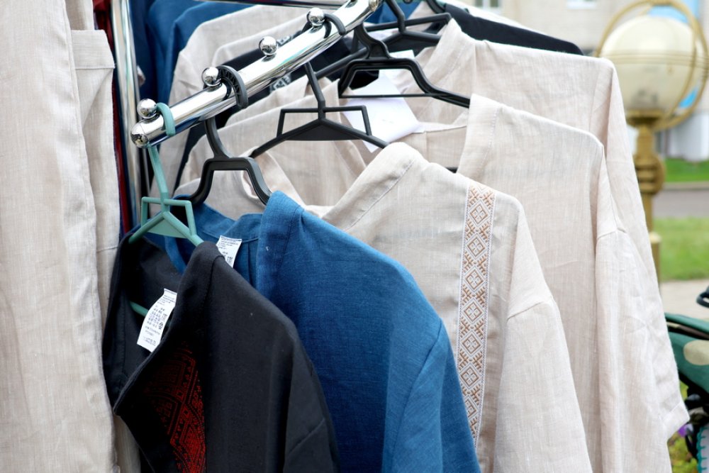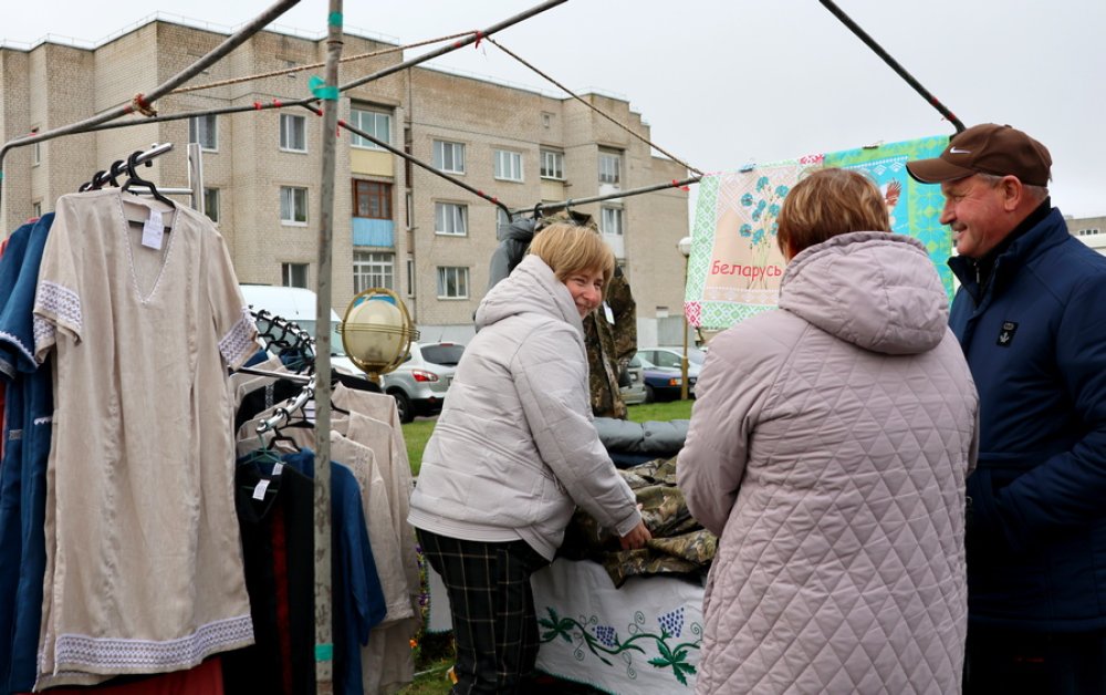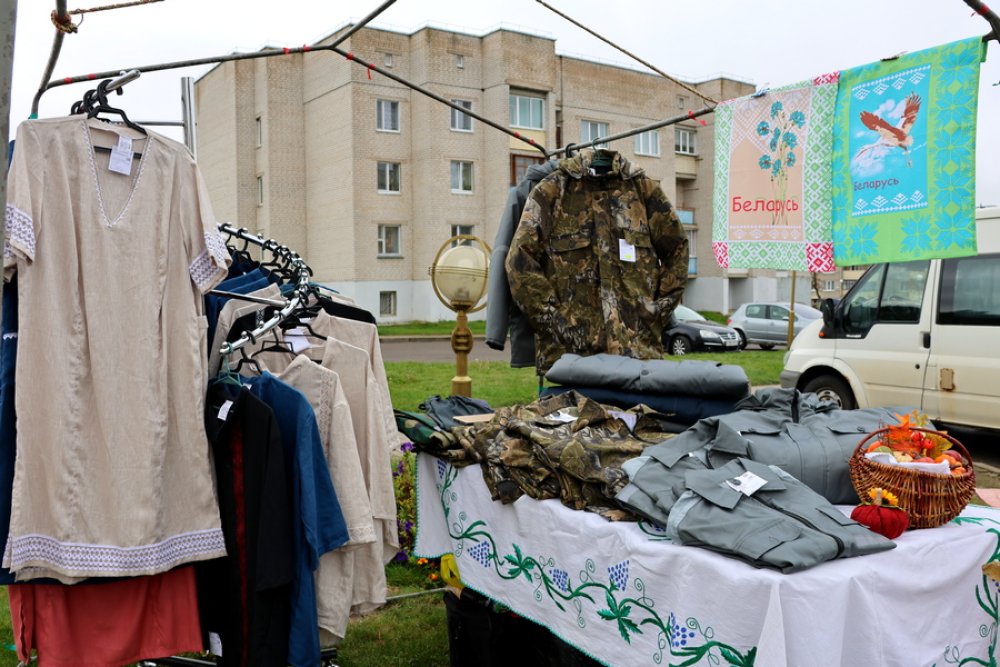 Новинка на ярмарке – изделия швейного цеха госпредприятия «Голынка». Представлена линейка спецодежды, льняных рубах, платьев, также других текстильных товаров.