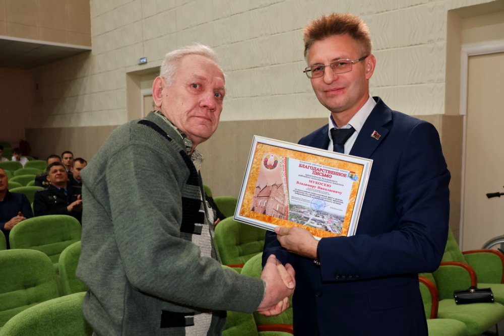 Юрий Владимирович вручил Благодарственное письмо председателя районного исполнительного комитета подполковнику милиции в отставке Антону Карповичу (в связи с плохим самочувствием – супруге) и капитану милиции в отставке Владимиру Мукосею.