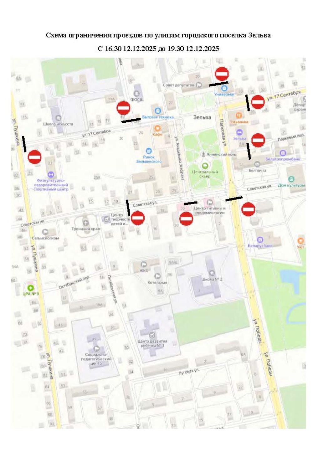 Во время проведения праздника зажжения огней и иллюминации поселка «Зажигаем по-новому», который состоится 12 декабря 2025 г. на площади городского поселка, будет перекрыто движение транспорта с 16:30 до 19:30 по ул. Победы (от перекрестка с ул. Советской), ул. Советской (дом номер 23), ул. Заслонова (здание Зельвенского районного исполнительного комитета), ул.17 Сентября (здание ресторана), ул. 17 Сентября (поворот на ул. Чапаева), ул. 17 Сентября (на пересечении с ул. Пушкина).