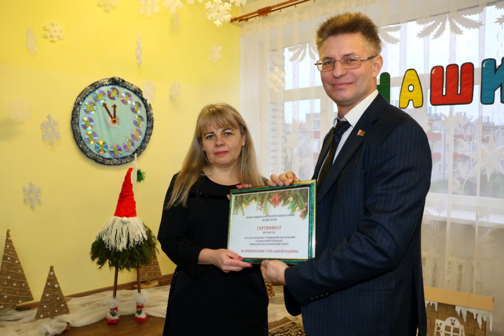 Юрий Владимирович вручил от районного исполнительного комитета директору СПЦ Ольге Дмитриевой подарочный сертификат на приобретение техники.