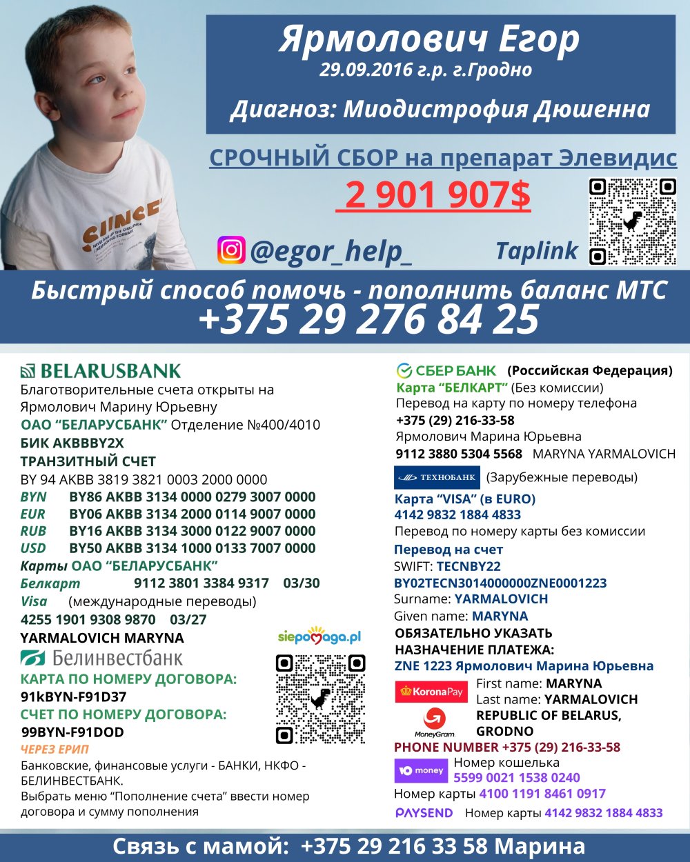 Срочный денежный сбор! О помощи просит мама Егора Ярмоловича. Ребенку из Гродно нужен дорогостоящий препарат Элевидис для лечения тяжелого заболевания. Давайте поможем мальчику все вместе!