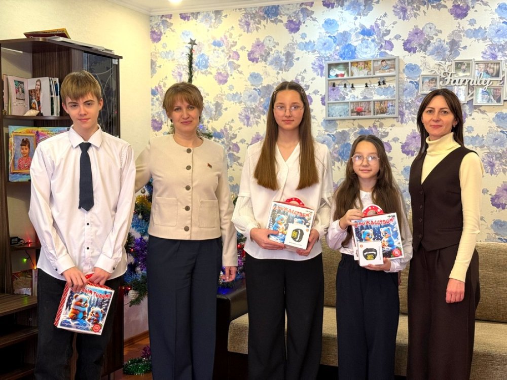 Наталья Николаевна и Ольга Юрьевна вручили сладкие гостинцы и подарки Ксении, Кире, Матвею и маленькой Софийке. А Татьяну Николаевну и Александра Александровича поблагодарили за достойное воспитание детей.