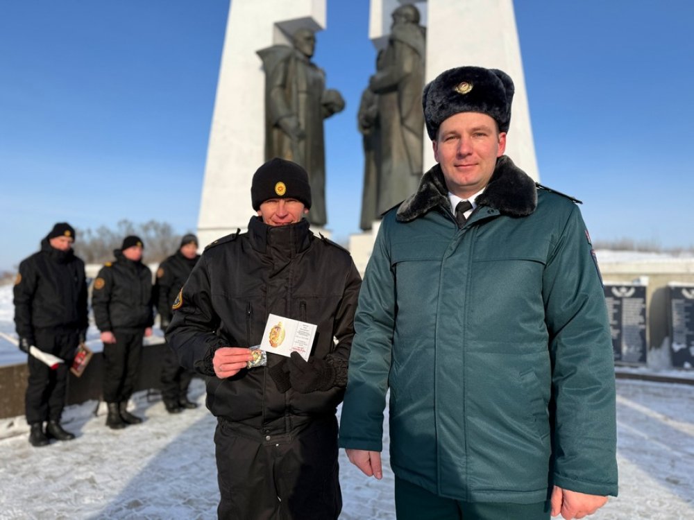 Алексей Михайлович вручил памятный нагрудный знак «165 лет пожарной службе» Дмитрию Лагунову, Андрею Ламеко и Олегу Цейкало.