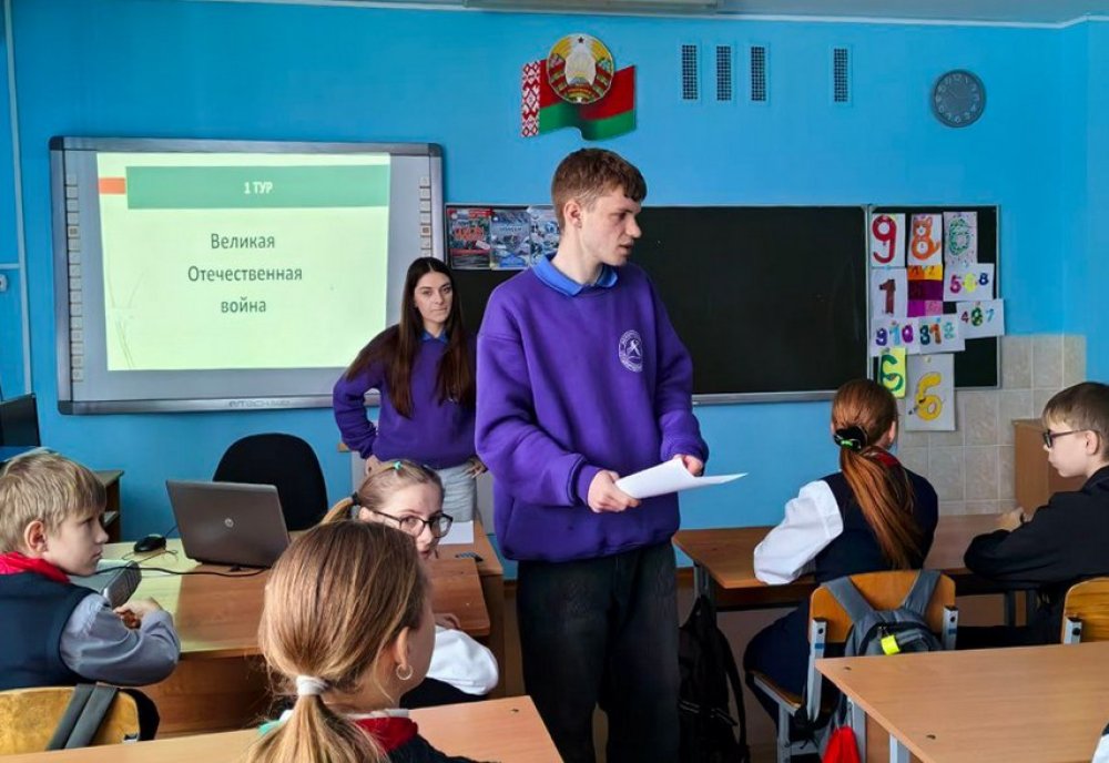 В основу организованного студентами занятия гражданско-патриотической тематики по истории Великой Отечественной войны было положено непосредственное и живое общение, сопровождаемое яркими видеороликами. После выполнения викторины слова ведущих о том, что каждый должен испытывать гордость за малую родину и Беларусь, прозвучали как наказ учащимся.