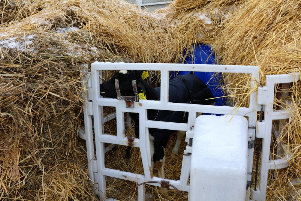 На МТК содержатся телята от 0 до 2 месяцев. После рождения их размещают в помещения, которые обогреваются за счет теплогенерирующих устройств. Спустя пару дней теперь на них будут надевать жилеты и только тогда переводить на улицу в боксы, со всех сторон и изнутри укрытые соломой.