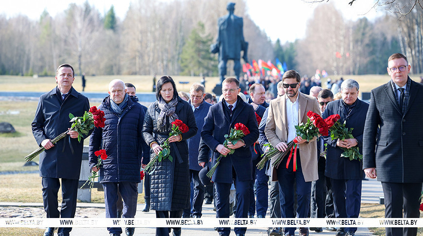 Цветы и цветочные корзины как символ глубокого уважения погибшим хатынцам и всем жертвам войны к фигуре Непокренного человека, братской могиле, в которой упокоен прах сожженных жителей деревни, и к Вечному огню возложили высшие должностные лица, руководители министерств и ведомств, возглавившие свои делегации, представители общественных объединений и организаций, молодежь, школьники, силовики, к которым присоединились воспитанники военно-патриотических клубов.