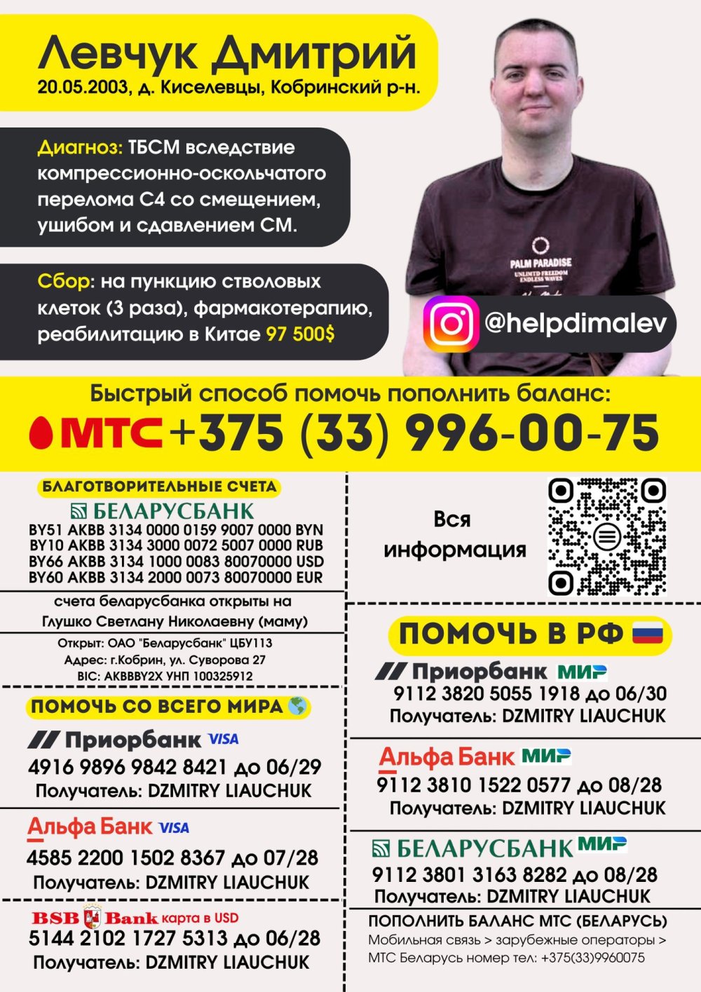 Помочь Диме можно, пополнив баланс МТС +375 33 996 00 75