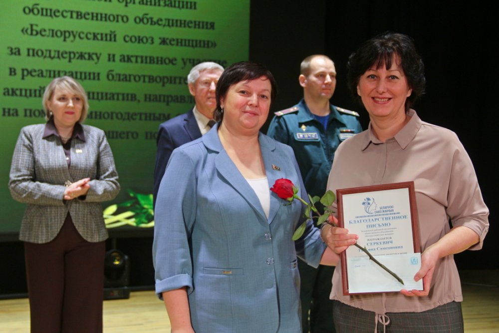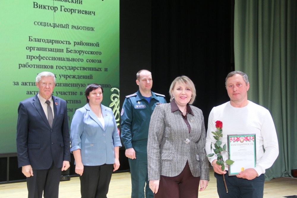 От лица районной организации Белорусского профсоюза работников государственных и других учреждений Инна Талерчик поблагодарила Виктора Янковского, Наталью Сосновскую, Анну Кохан. Благодарностью районной организации общественного объединения «Белорусский союз женщин» отмечены Ирина Булавкина и Татьяна Серкевич. В числе тех, кто пропагандирует активное долголетие среди людей серебряного возраста и организует интересный досуг данной категории граждан, лидер ветеранского движения Сергей Баган отметил Нину Верстак и ветерана труда Софью Соколовскую. За тесное и плодотворное сотрудничество, эффективную работу по обеспечению безопасности жизнедеятельности граждан начальник РОЧС Алексей Якимович поблагодарил Екатерину Русак, Марину Книгу, Настасью Козел.