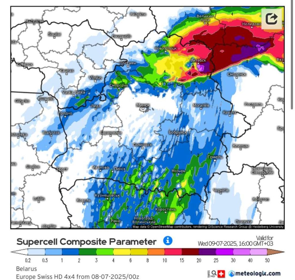 Но самое интересное ждет во второй половине дня. Исходя из ряда климатических факторов, на северо-востоке Беларуси высока вероятность образования торнадо.
