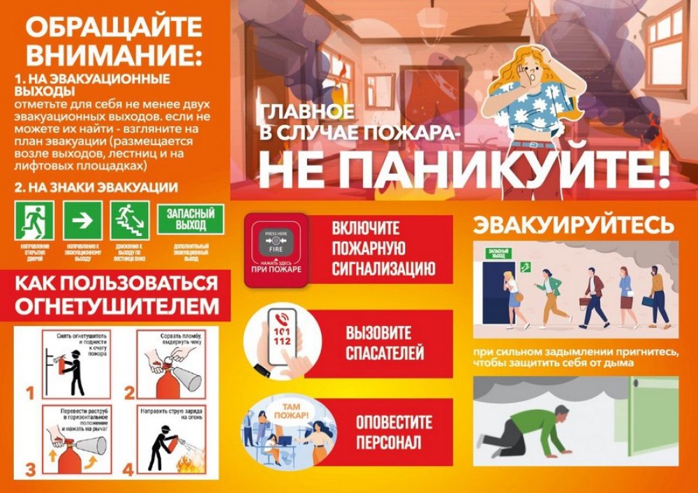 Действуйте быстро и уверенно. Немедленно нажмите кнопку пожарной сигнализации. Немедленно сообщите о случившемся по телефонам 101 или 112.