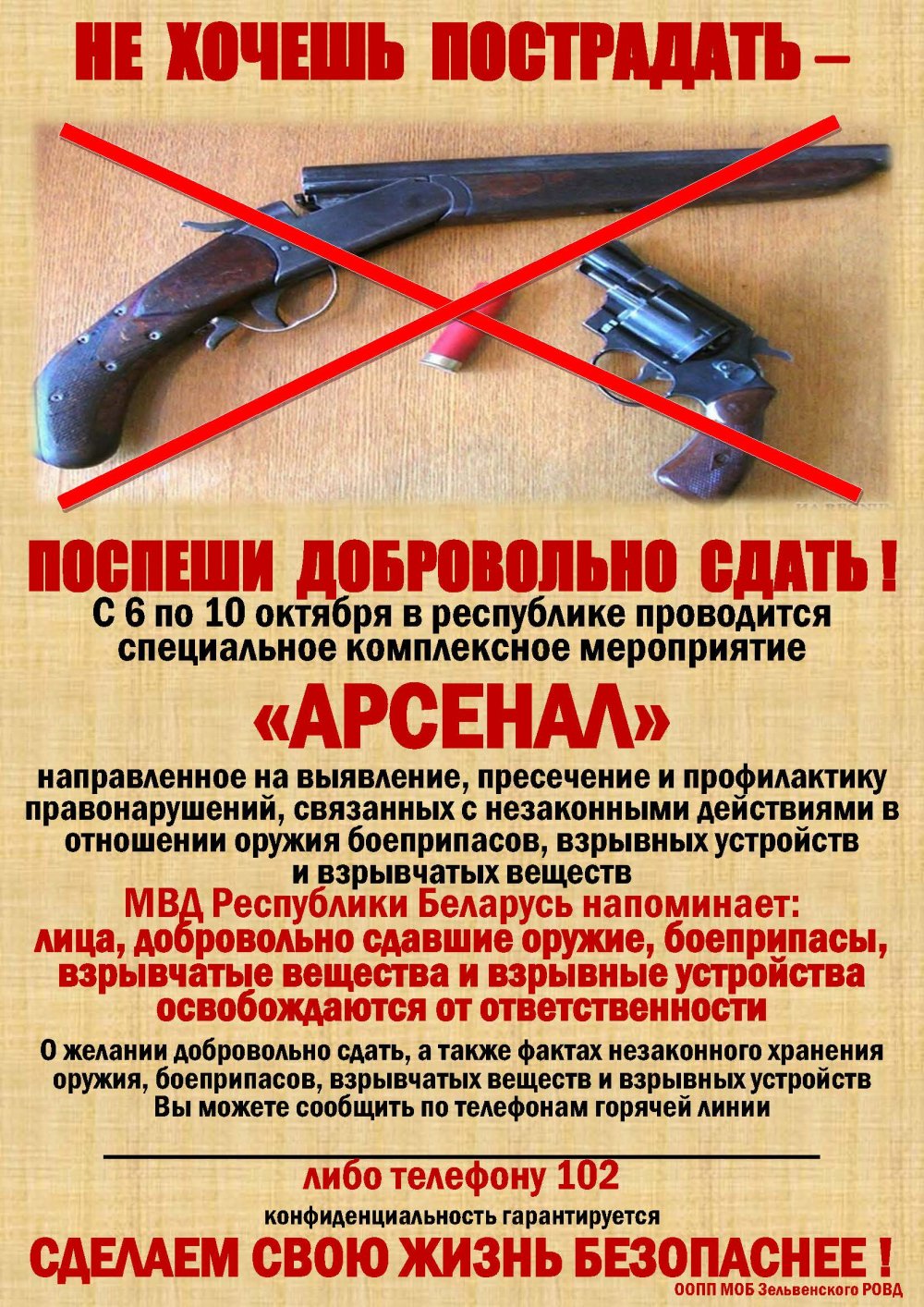 Если вам известны факты незаконного хранения оружия и боеприпасов, изготовления, сбыта оружия, взрывчатых веществ, Вы можете сообщить на линию 102, либо по номеру телефона 7-15-94. Анонимность гарантируем!