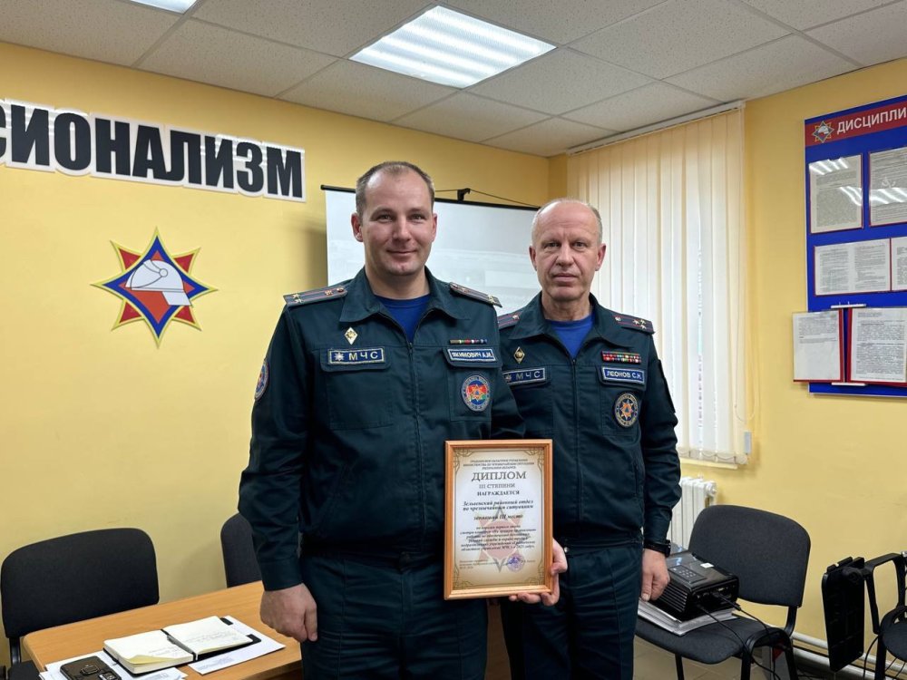 В завершение мероприятия первый заместитель руководителя областного управления МЧС вручил начальнику отдела Алексею Якимовичу диплом III степени по итогам первого этапа смотра-конкурса «На лучшую организацию работы по обеспечению безопасных условий службы и охране труда в подразделениях учреждения «Гродненское областное управление МЧС» в 2025 году»,