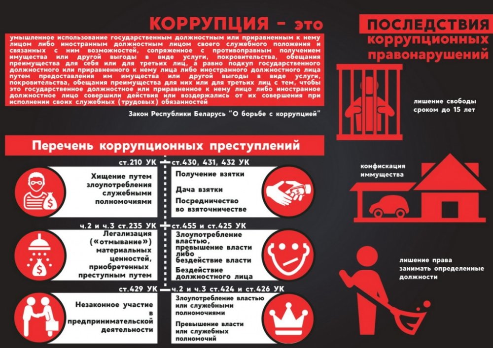 Коррупция на современном этапе развития любого общества является серьезной общественно-политической проблемой и барьером на пути здорового развития общества, подрывает его моральные устои, доверие к власти, препятствует конкуренции, затрудняет экономические и социальные преобразования. Поэтому в концепции национальной безопасности эффективное противодействие коррупции в Республике Беларусь определено в качестве одного из основных национальных интересов. Борьба с коррупцией основывается на принципах законности, справедливости, равенства перед законом, гласности, приоритета мер предупреждения коррупции, неотвратимости ответственности, личной виновной ответственности, гуманизма.