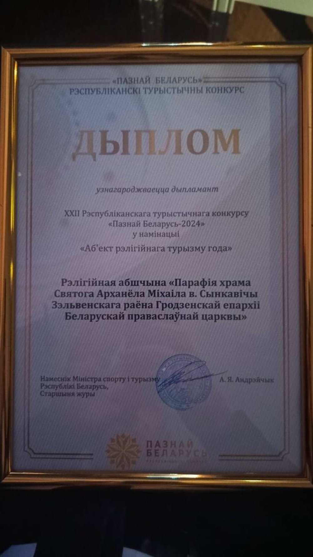 Сектором спорта и туризма Зельвенского райисполкома было сформировано несколько заявок на участие. По итогам конкурса в номинации «Объекты религиозного туризма» заявка стала дипломатом в данной номинации с объектом Храма Святого Архангела Михаила в деревне Сынковичи. Участие в торжественной церемонии награждения приняли заместитель председателя райисполкома Сергей Лойко и заведующий сектором спорта и туризма райисполкома Андрей Макаревич.