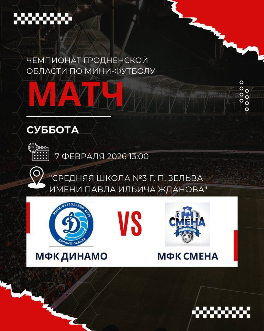 В рамках чемпионата области по мини-футболу "Динамо-Зельва" в домашнем поединке встречается с волковысской командой "Смена".