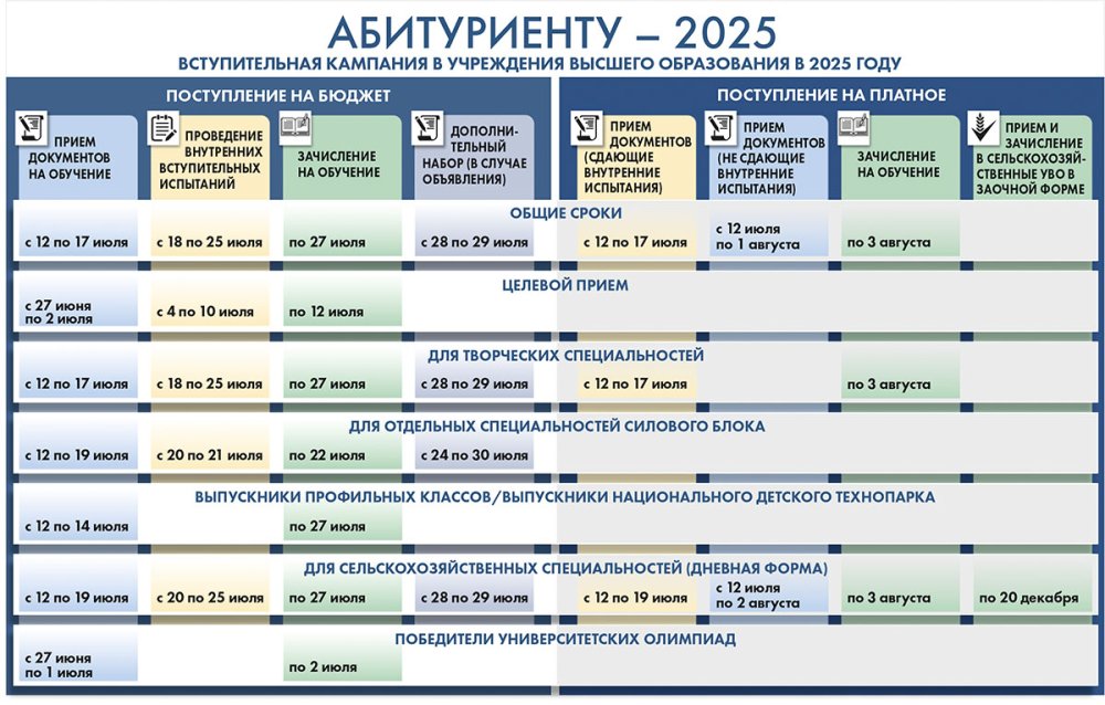 У ребят будет шесть дней, чтобы подать документы в приемную комиссию – их примут до 17 июля, сообщает СБ. На некоторые специальности сельскохозяйственного профиля и в вузы силовых структур выделяется на пару дней больше. Начальник главного управления профессионального образования Минобразования Сергей Пищов обозначил самые важные особенности нынешнего сезона.