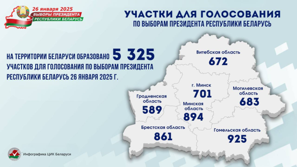 ЦИК сообщает, что наибольшее число участков для голосования сформировано в Гомельской и Минской областях (925 и 894 соответственно), 861 - в Брестской области, 701 - в г. Минске, 683 - в Могилевской области, 672 - в Витебской области и 589 - в Гродненской области.