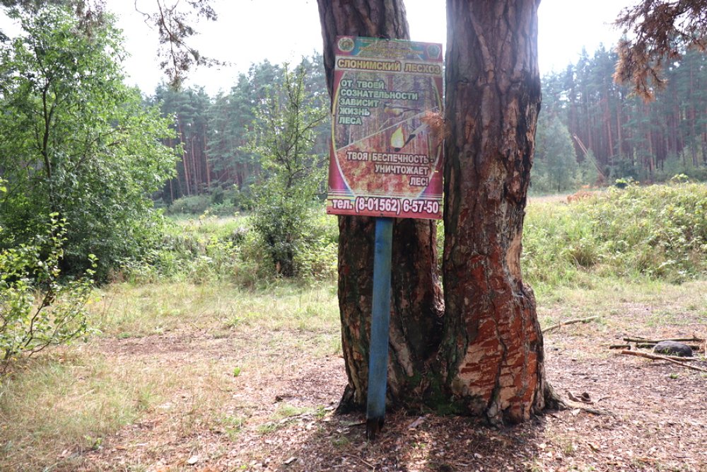 Пройдя дальше, возле одной из зон отдыха мы обнаружили сломанный щит противопожарной тематики, который кто-то прислонил к дереву. По-видимому, вандалам пришлось приложить немало усилий, поскольку брус, на котором крепится плакат, довольно толстый.