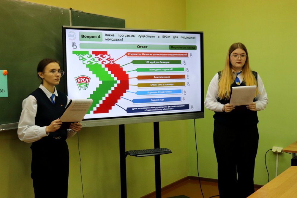 С помощью викторины ребята актуализировали свои знания о Белорусском республиканском союзе молодежи, его символике, направлениях работы. Особо отметили, что БРСМ – это крупное молодежное объединение страны, которое поддерживается Президентом Александром Лукашенко. Назвали основные цели и задачи, стоящие перед союзом молодежи.