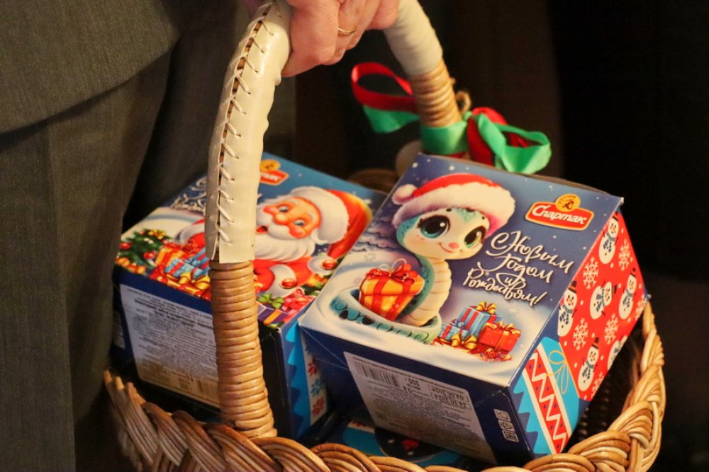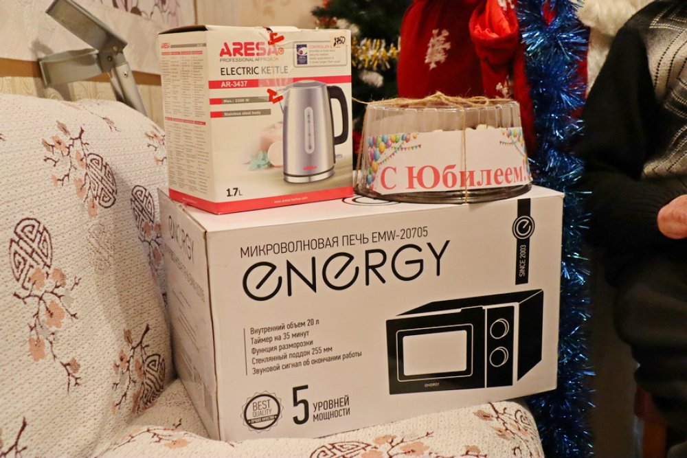 Четырём жителям дома вручили сладкие подарки, продуктовые наборы, новую микроволновую печь и электрический чайник.