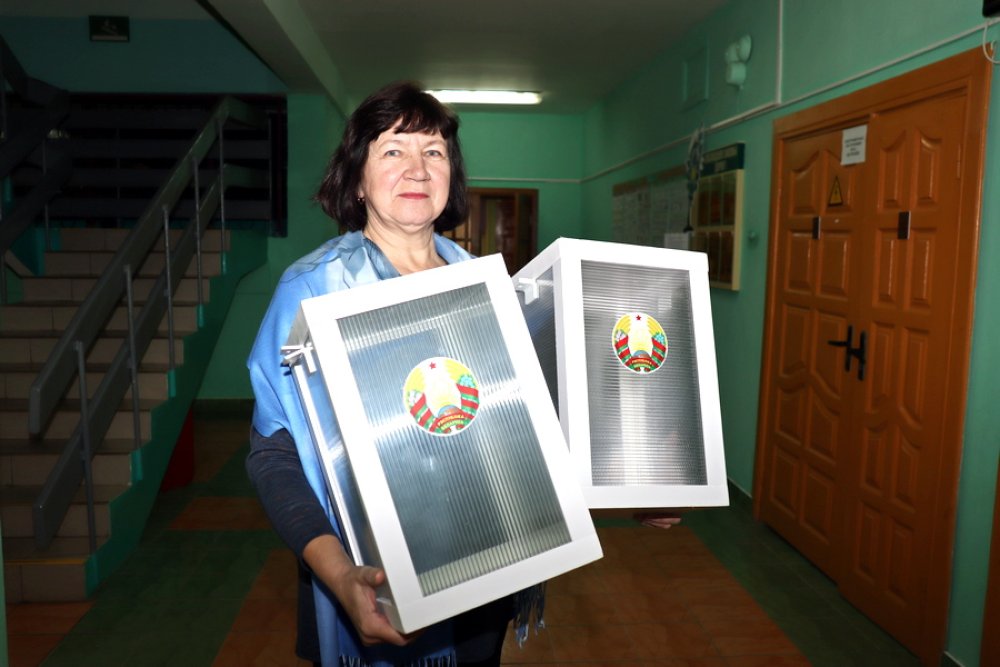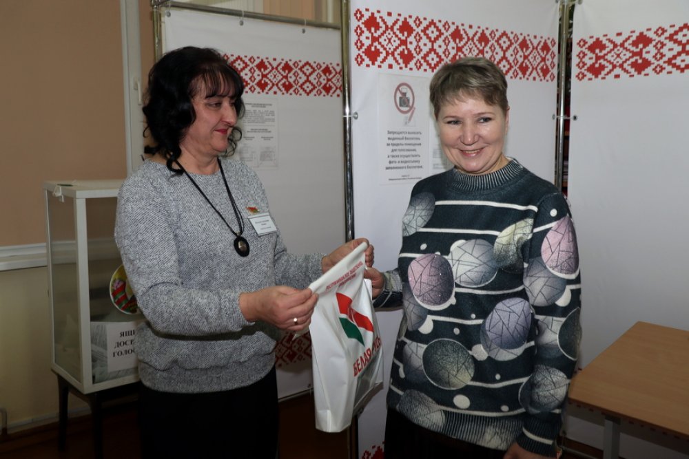 Первому голосующему в день выборов вручили подарок от районной организации общественного объединения "Белая Русь".