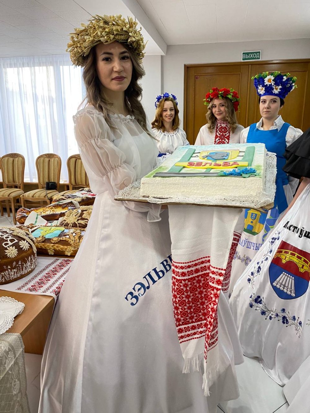 В фойе также развернулась выставка караваев общественного объединения БСЖ «Символы моей малой родины». Почетное место среди символов других регионов занял красочный зельвенский каравай.
