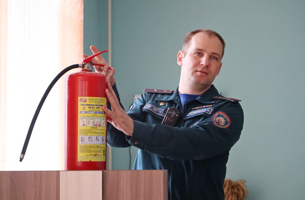 – Перед применением огнетушителя необходимо сорвать пломбу, выдернуть чеку, направить шланг на очаг пожара и нажать на рычаг, – пояснил начальник райотдела по ЧС Алексей Якимович.