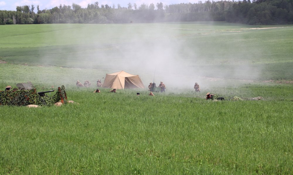 На демонстрационной площадке недалеко от сцены хозяевам и гостям фестиваля была представлена реконструкция событий Великой Отечественной войны.