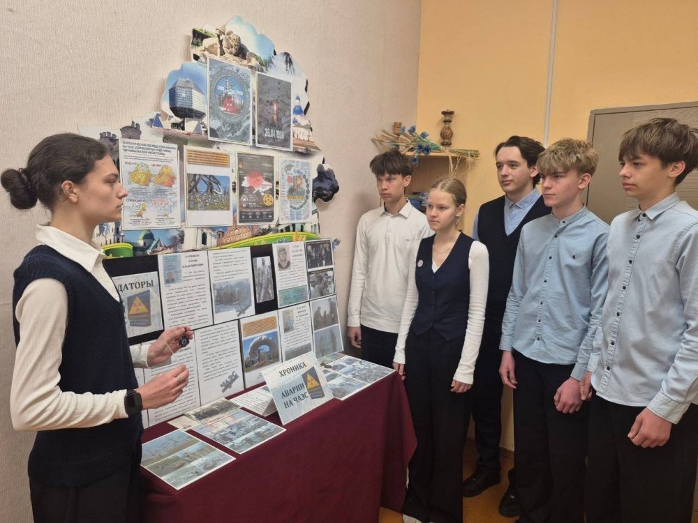 На стендах представлена хроника аварии, от предшествующих ей событий до отдаленных последствий в наши дни.
