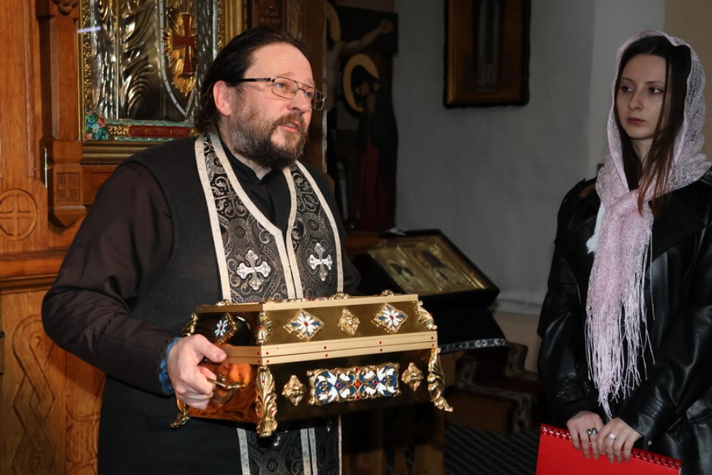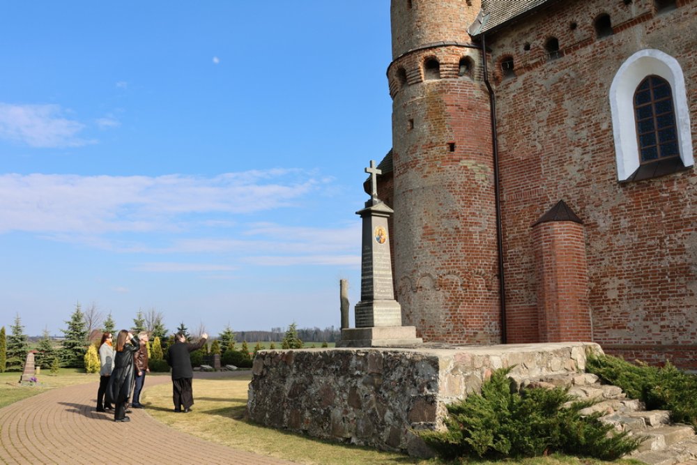 Иерей Александр Авсиевич встретил гостей у стен. Сначала он рассказал об архитектуре: почему строители выбрали именно готические своды и как эта крепость защищала людей в смутные времена. Слушая его, невольно представляешь себя на месте тех, кто приходил сюда сотни лет назад.