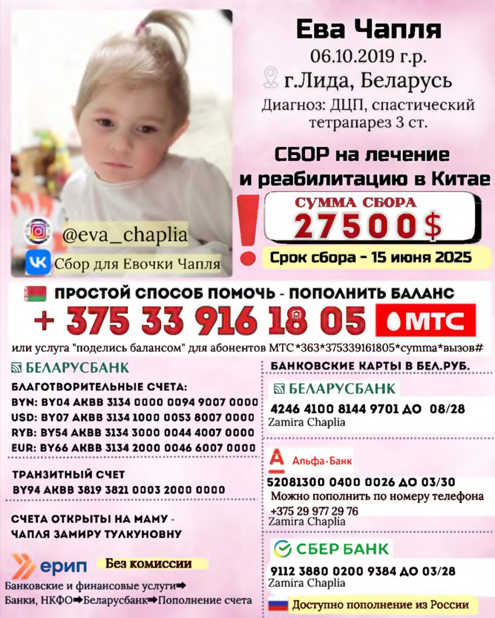 Нужна помощь в сборе средств на лечение лидчанки Евы Чапли