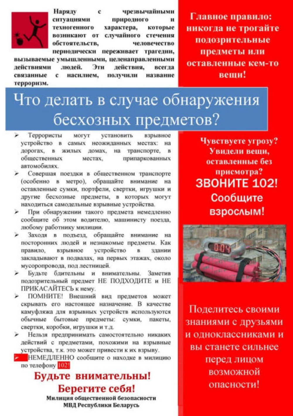 С целью недопущения чрезвычайных ситуаций каждый должен проявлять бдительность и информировать органы внутренних дел обо всех подозрительных предметах, оставленных в общественных местах без присмотра (сумки, портфели, свертки, игрушки и т.д.).