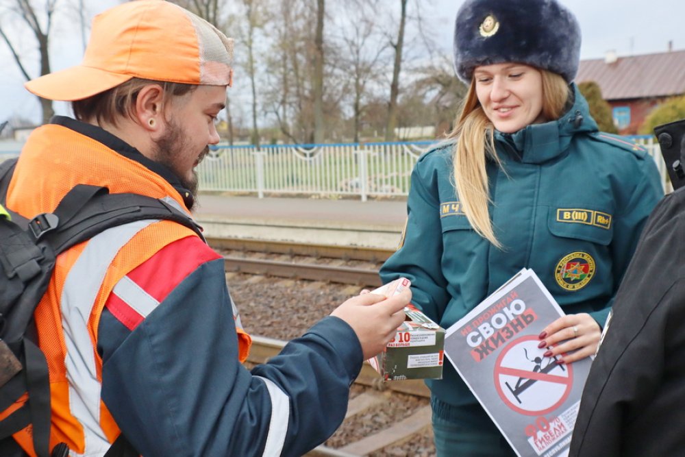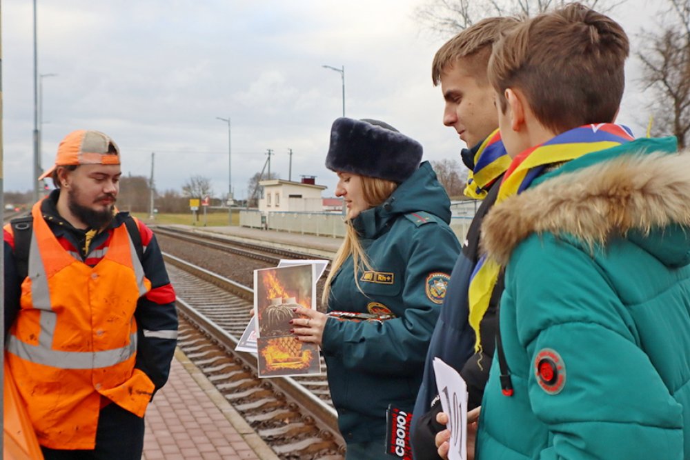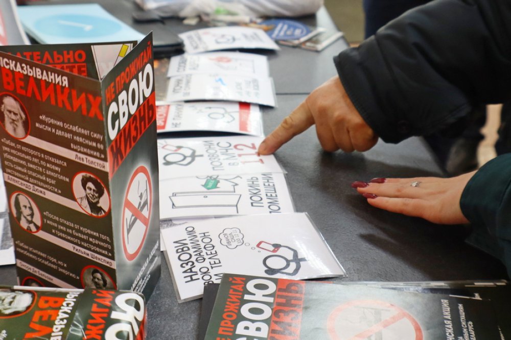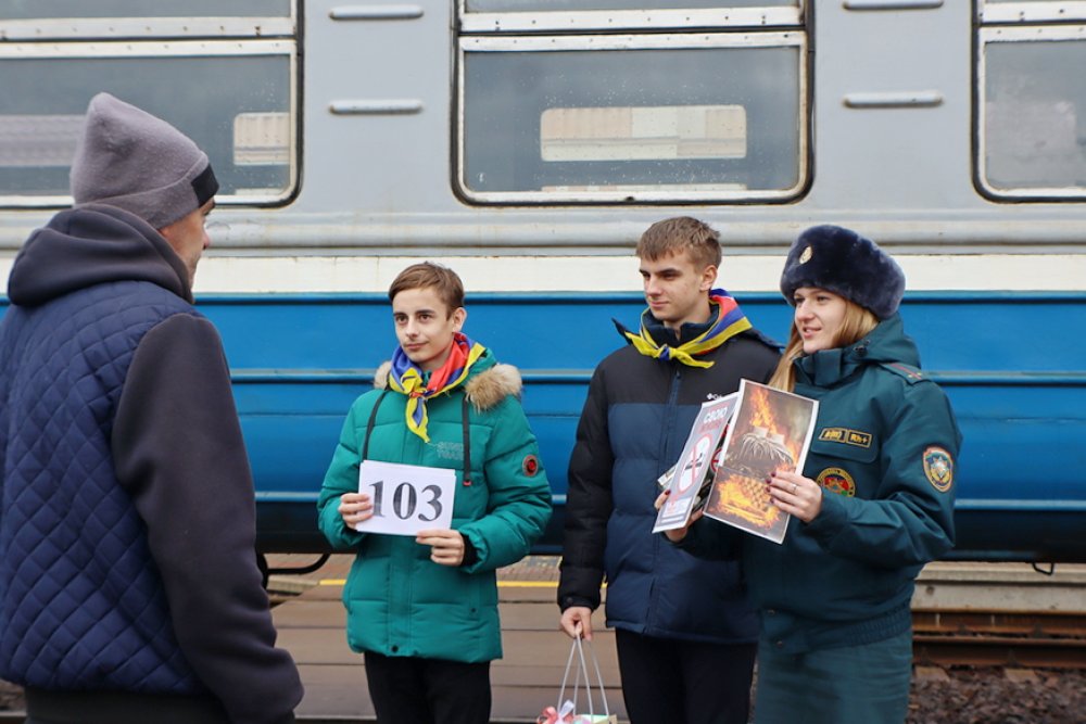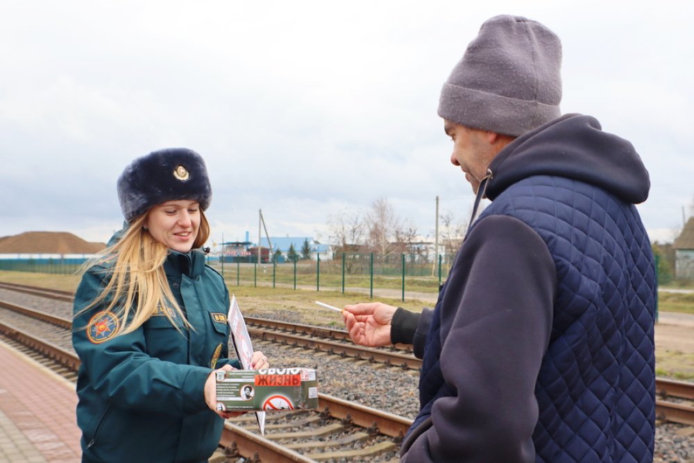 Второй точкой маршрута стал железнодорожный вокзал. Работник райотдела по ЧС предложила прохожим обменять сигарету на конфету, к которой был прикреплён номер службы спасения. Кроме того, все участники акции ушли с буклетами, содержащими информацию о вреде курения.