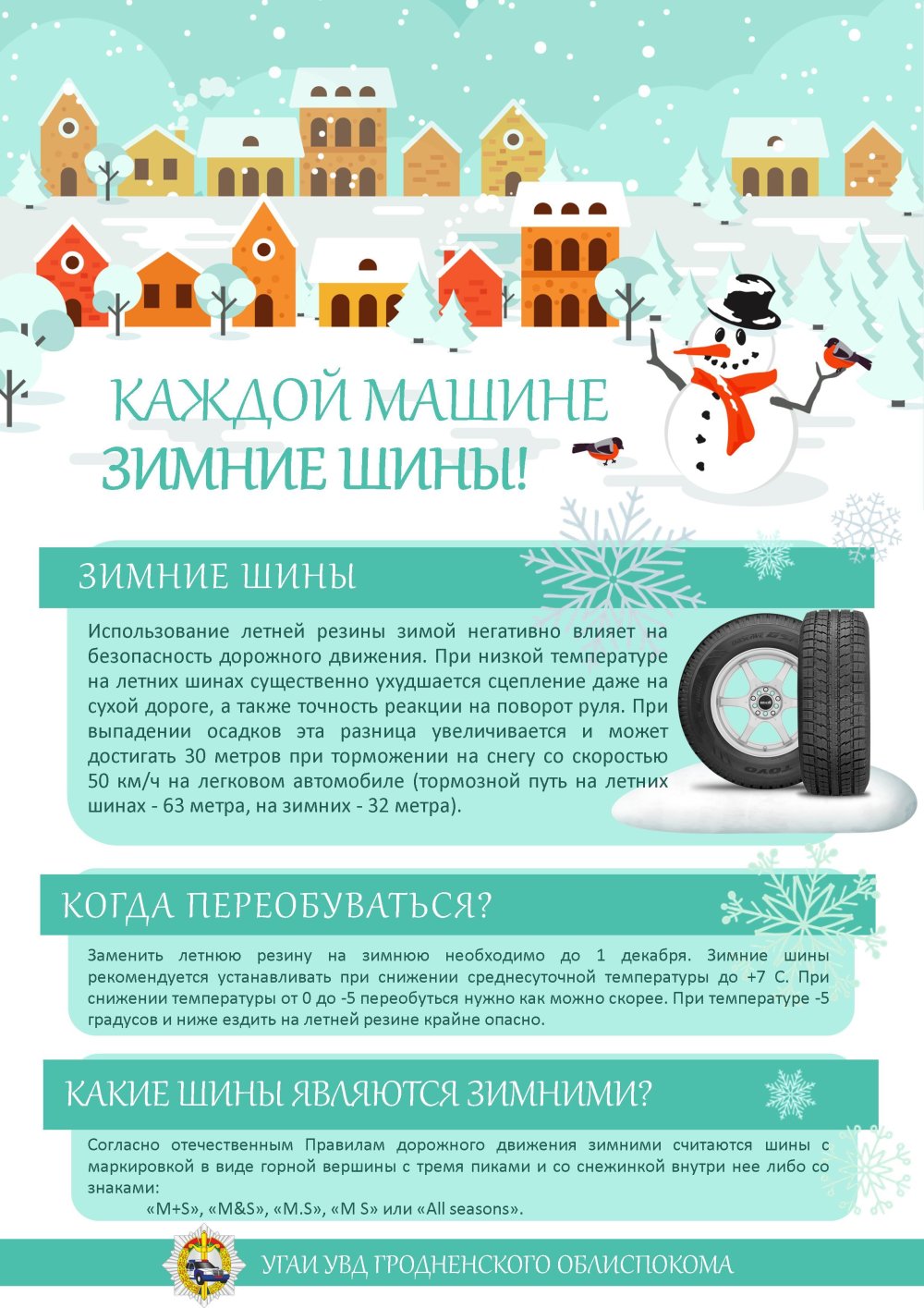 Уважаемые автомобилисты, помните, что в зимний период на аварийность в значительной степени влияют шины, установленные на вашем транспортном средстве. Зимние шины помогают сократить тормозной путь и значительно улучшают управление автомобилем в условиях гололеда и снежного наката.